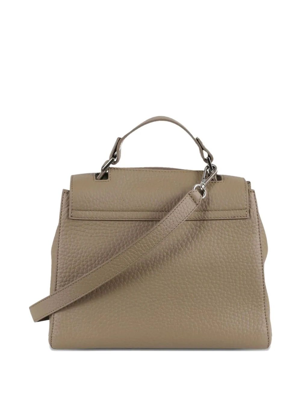Верхняя ручка из бежевой шагреневой кожи, съемный плечевой ремень, застежка на клапане с надписью-логотипом