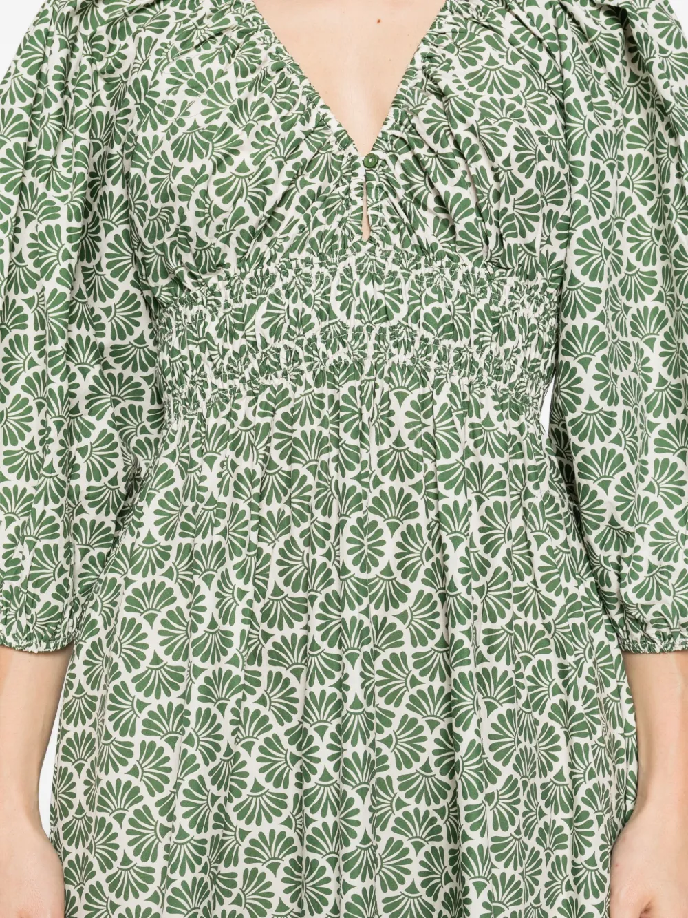Присборенный лиф с зеленым цветочным принтом, V-образный вырез, рукава три четверти, рукава-буфы.