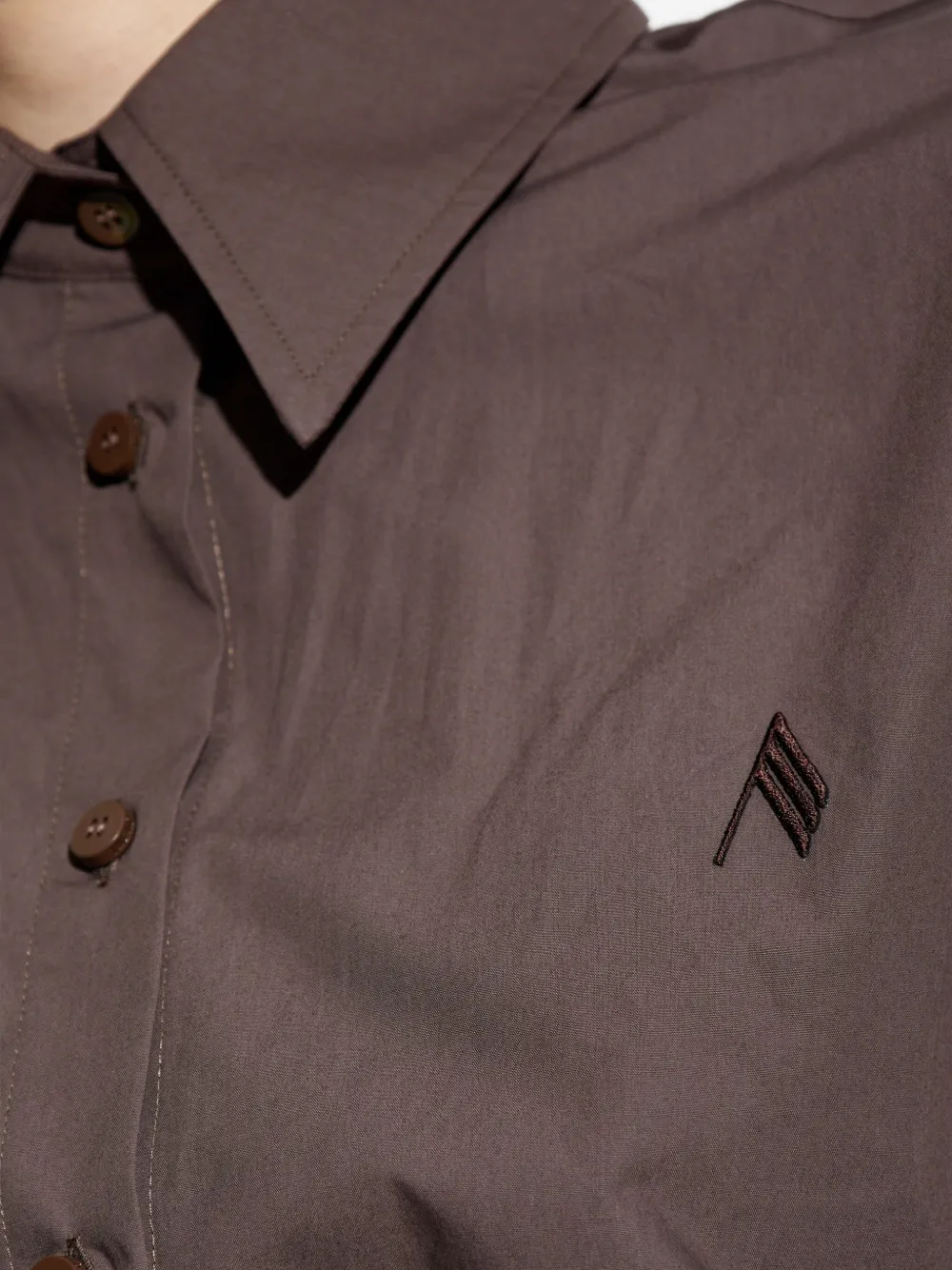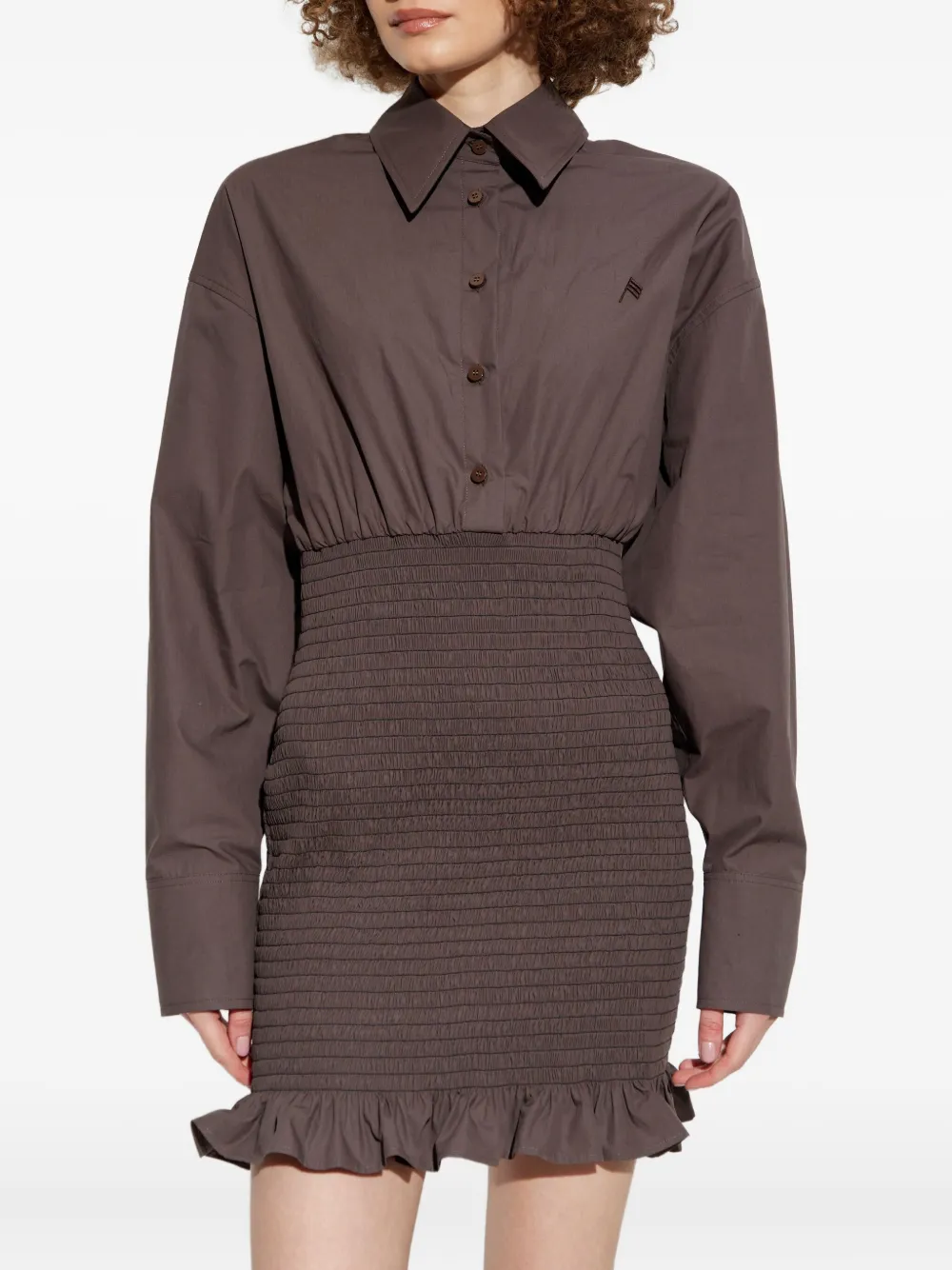 Коричневый присборенный дизайн, оборчатый подол, воротник рубашки, длинные рукава, застежка на пуговицы.