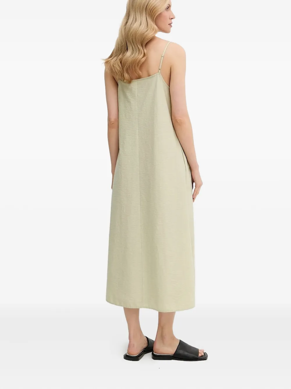 Светло-зеленый присборенный вырез, длина миди, боковые швы, карманы, тонкие бретели, А-образный силуэт.