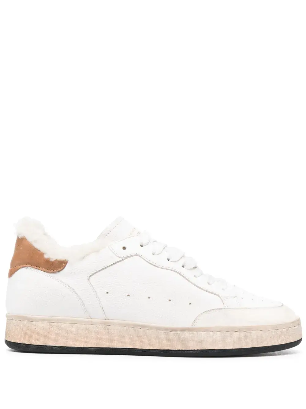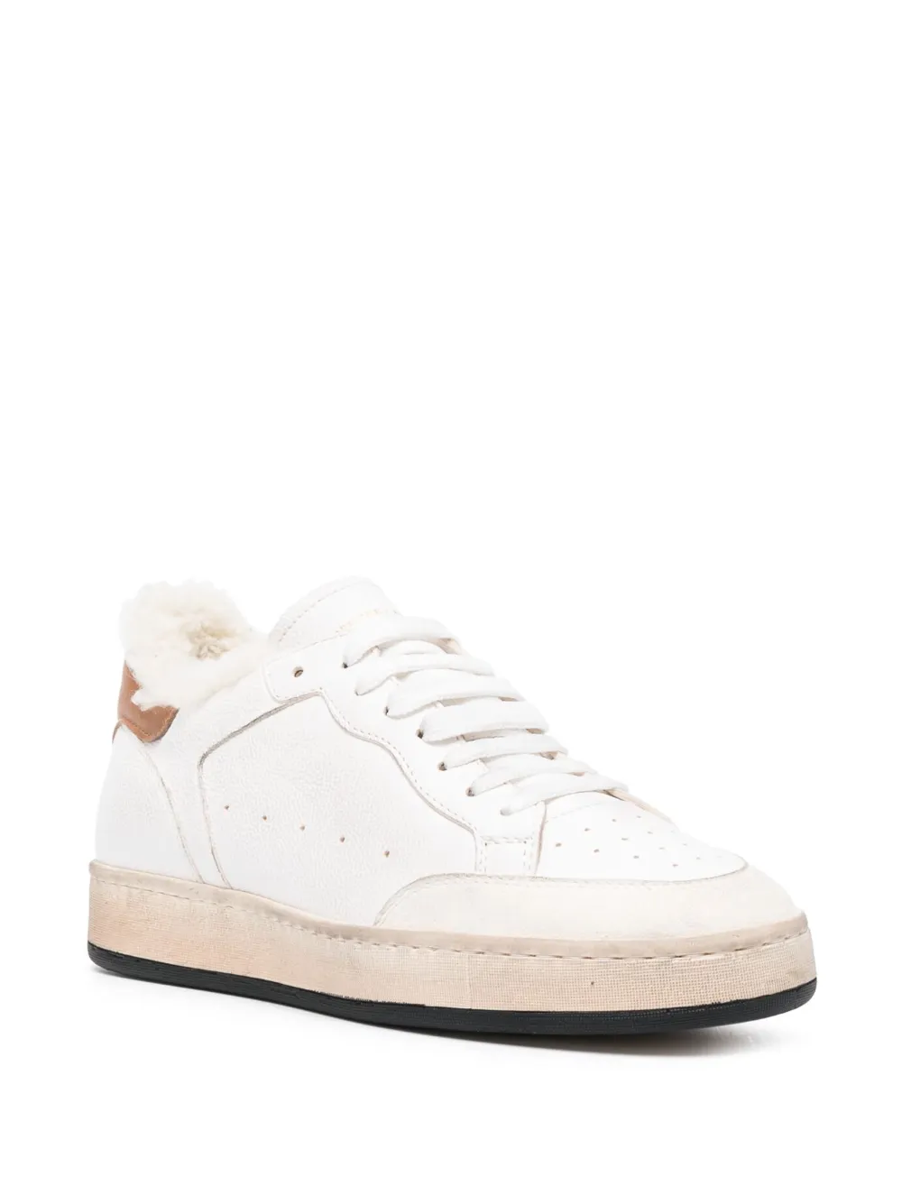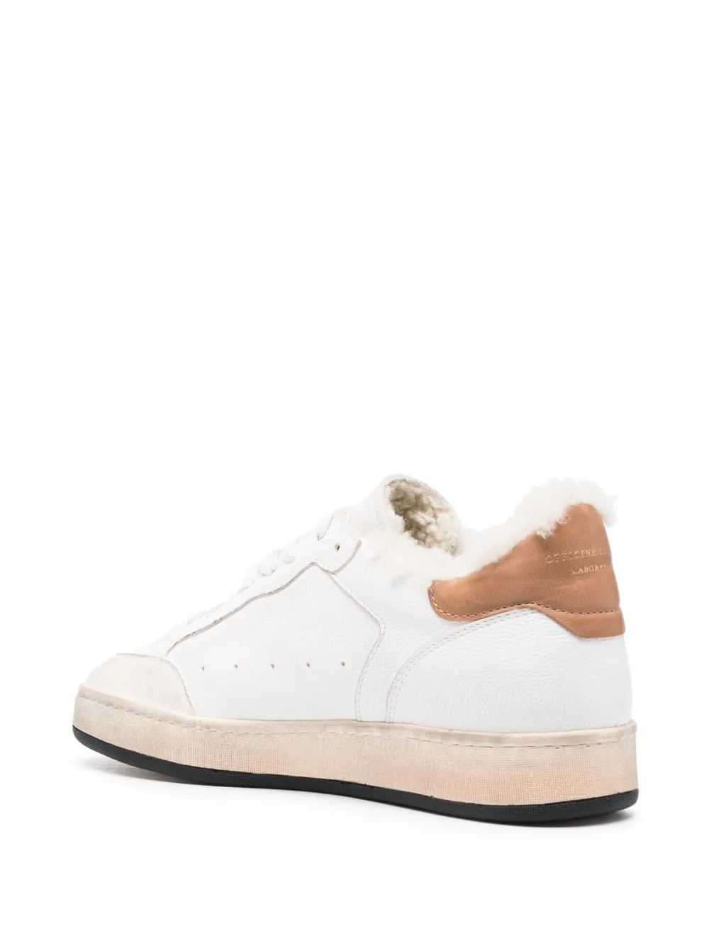 Белый, коричневый, телячья кожа, вставки, перфорация, язычок с логотипом, золотистый логотип, задник с логотипом, петля для подтягивания сзади, стелька с логотипом, закругленный носок, шнуровка спереди, высота по щиколотку и плоская резиновая подошва.