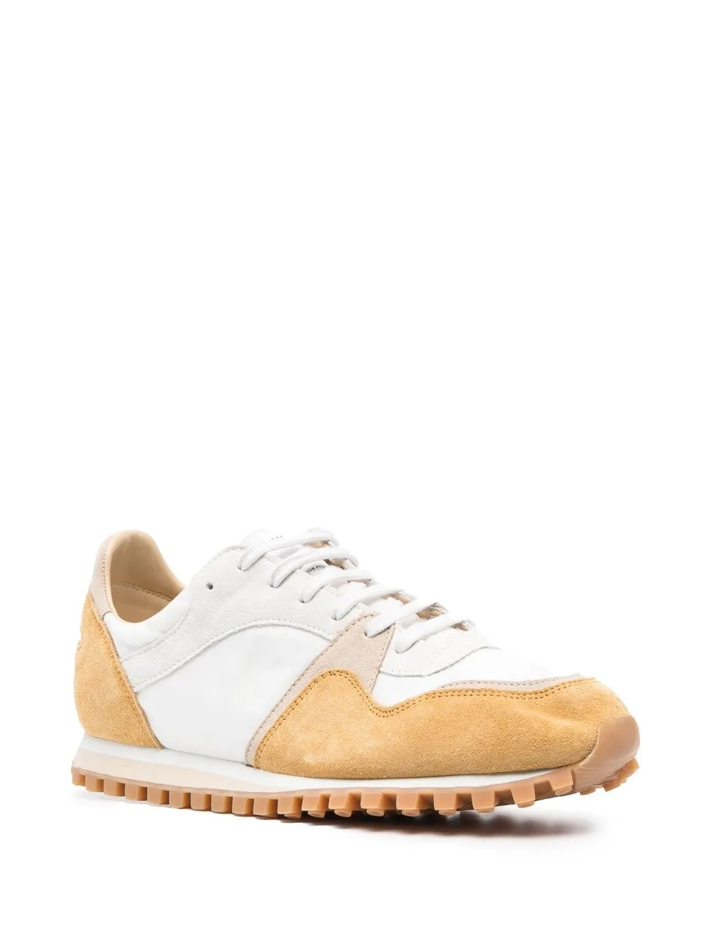 Желтый, телячья кожа, вставки, нашивка с логотипом на язычке, закругленный носок, шнуровка спереди, стелька с логотипом и рифленая резиновая подошва.