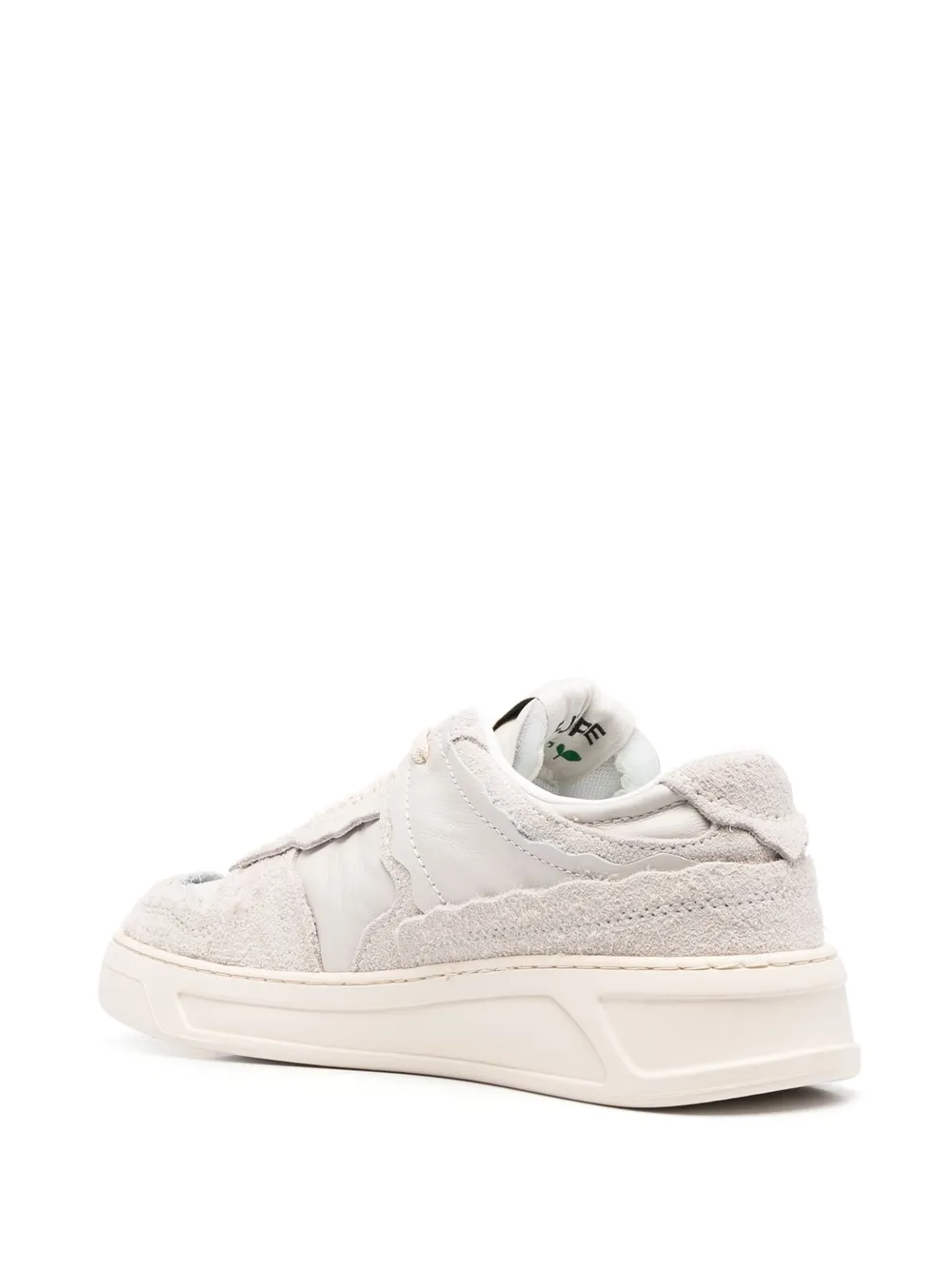 Кремовый, телячья кожа, логотип сбоку, нашивка с логотипом на язычке, закругленный носок, шнуровка спереди, стелька с логотипом и плоская резиновая подошва.