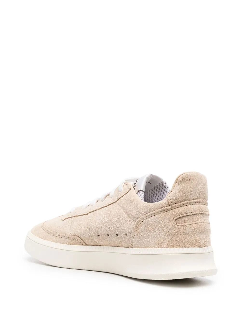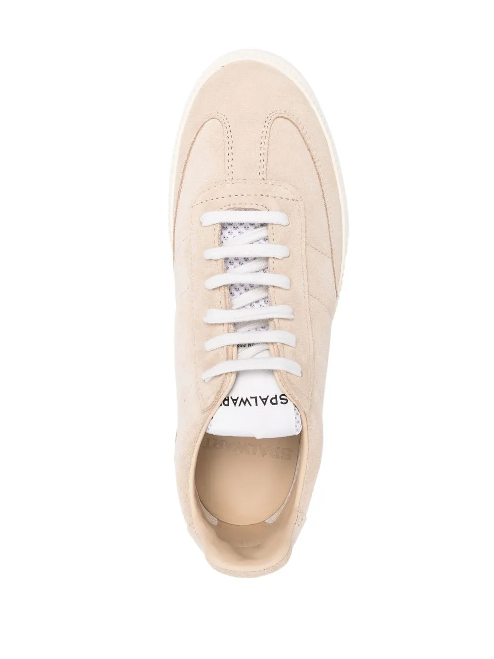 Бежевый, кожа, замша, нашивка с логотипом на язычке, закругленный носок, шнуровка спереди и плоская подошва.