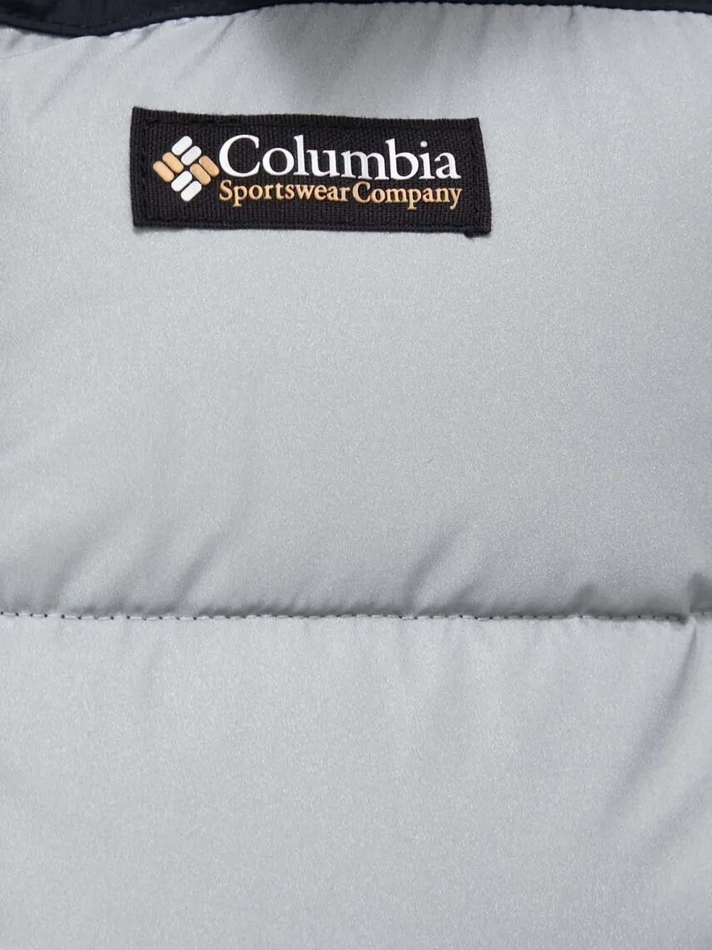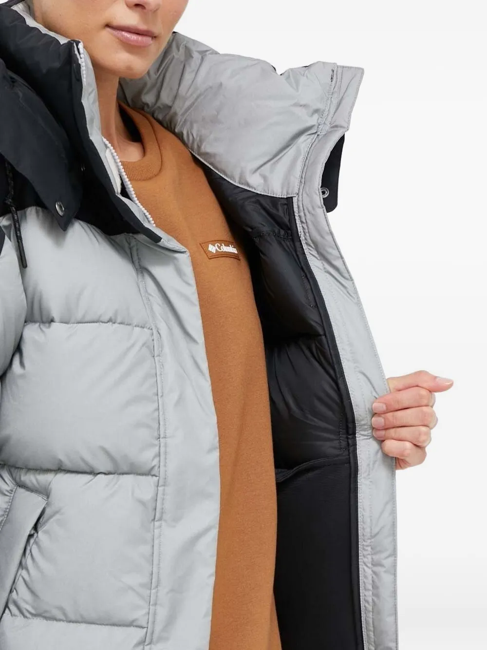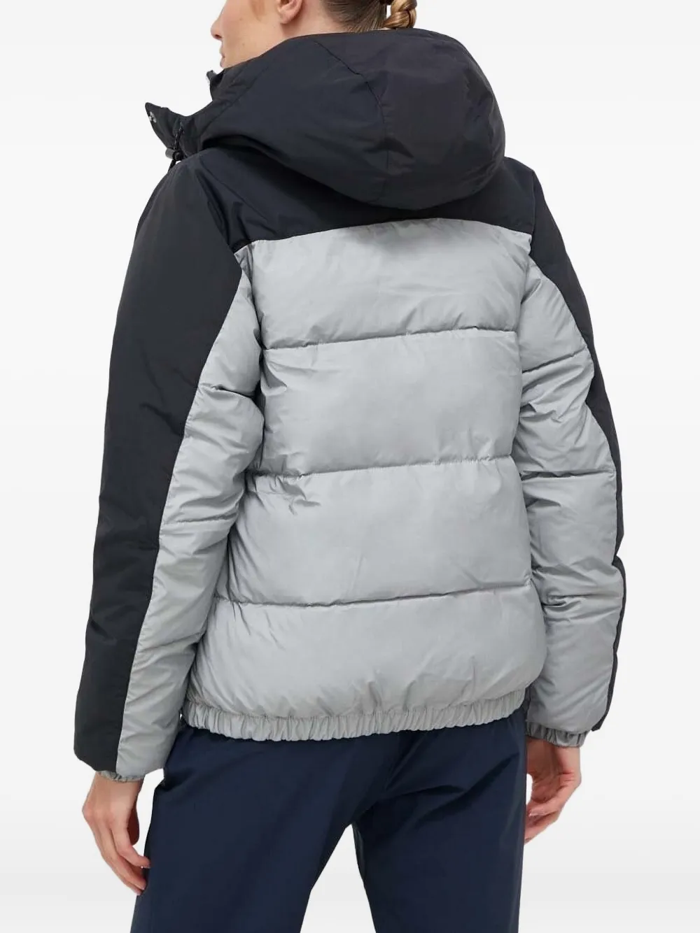 Стеганый серебристо-серый дизайн, двухцветные панели, пришитый капюшон, застежка-молния по всей длине, длинные рукава