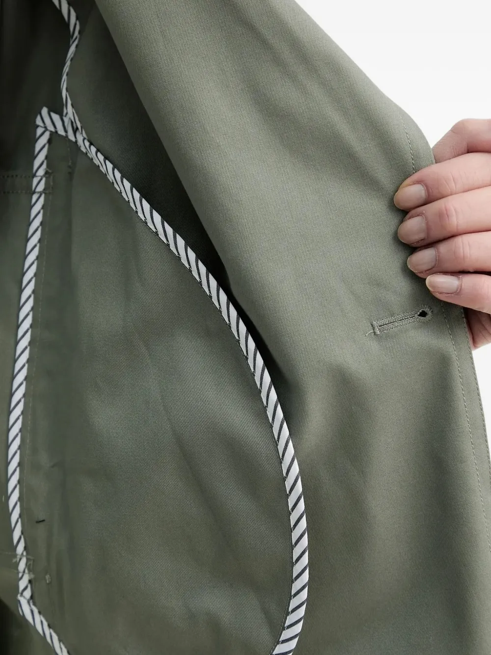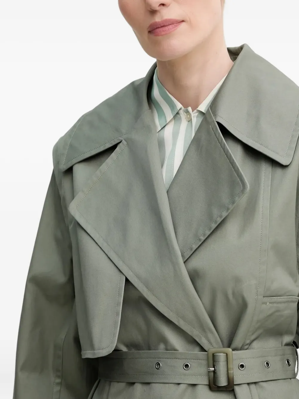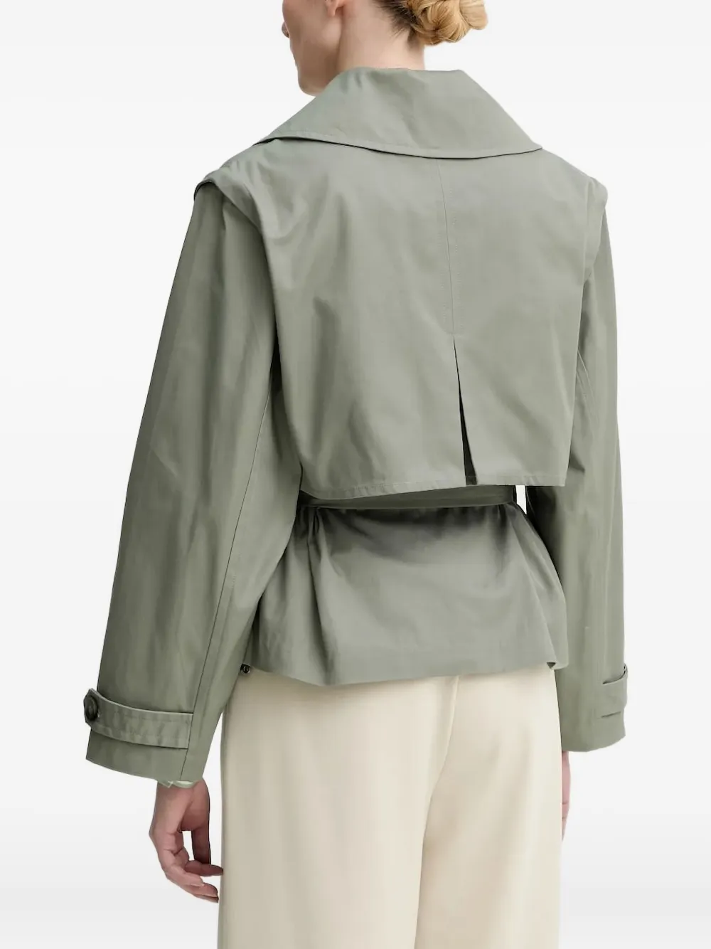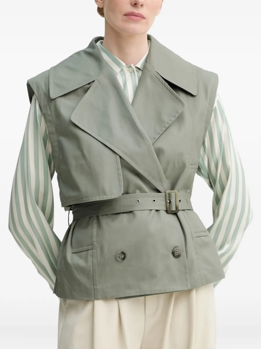 Двубортный пиджак шалфейно-зеленого цвета с широкими лацканами, поясом и карманами с клапанами.