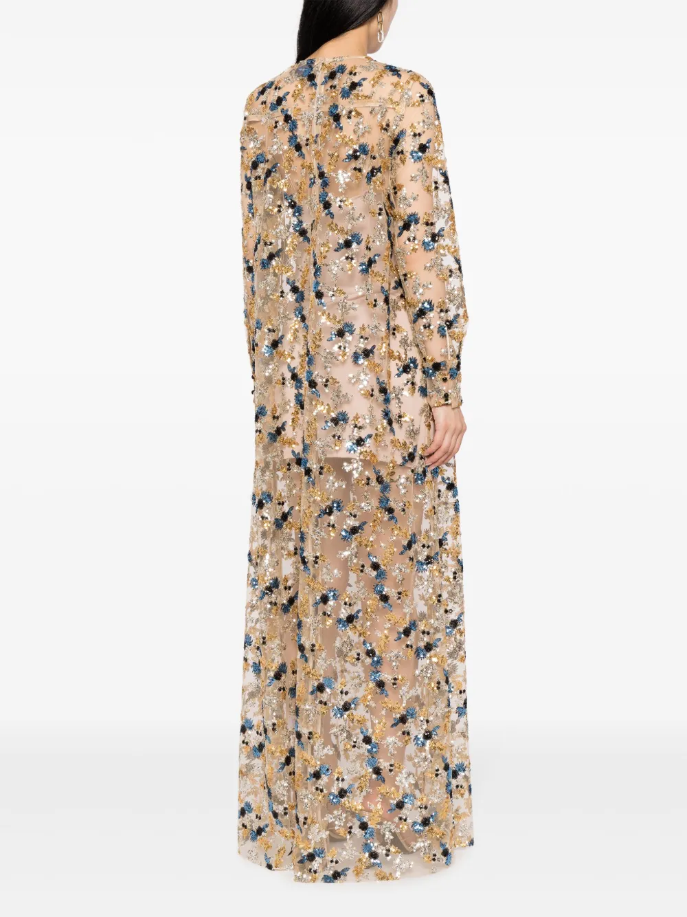 Бежевый, разноцветный, сетчатый тюль, полупрозрачный дизайн, сплошная цветочная вышивка, украшение из пайеток, круглый вырез, длинные рукава, застежка на молнии сзади, расклешенный подол и длинная модель.