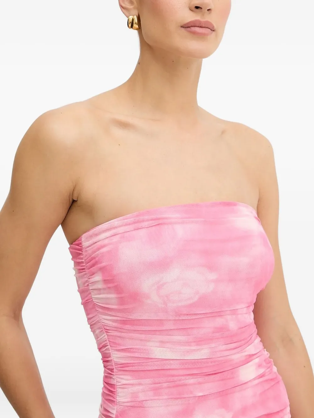 Розовый тай-дай, лиф с рюшами, вырез без бретелек, многоярусная юбка длины миди