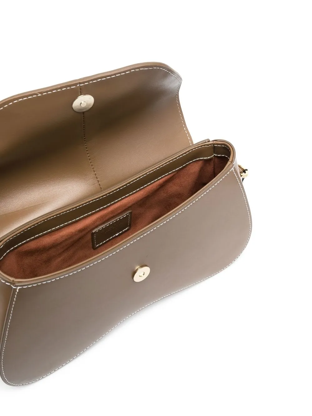 Коричневый, телячья кожа, контрастная строчка, съемный ремень на плечо, откидной верх с застежкой на кнопки, основное отделение и нашивка с логотипом внутри.