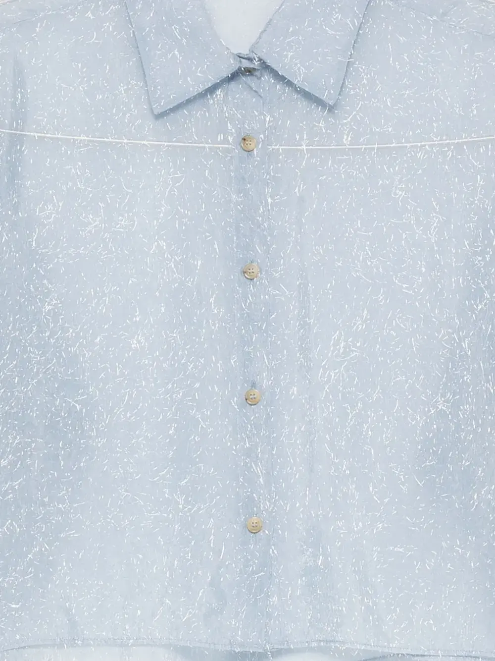 Светло-голубой узор в крапинку, длинные рукава, застежка на пуговицы, воротник-стойка, укороченный подол.