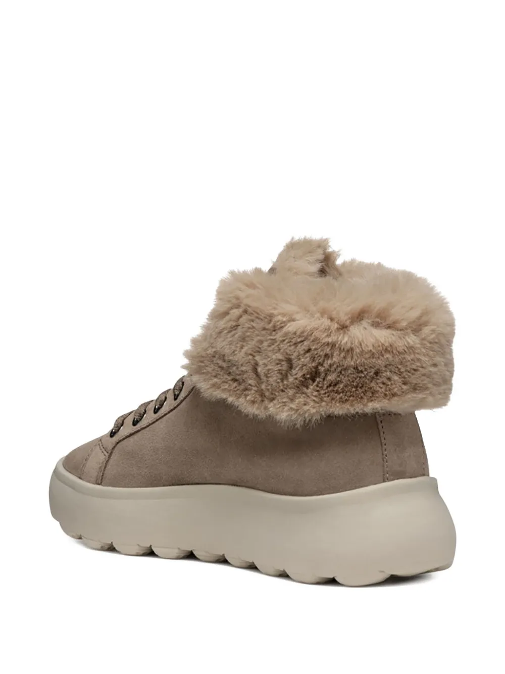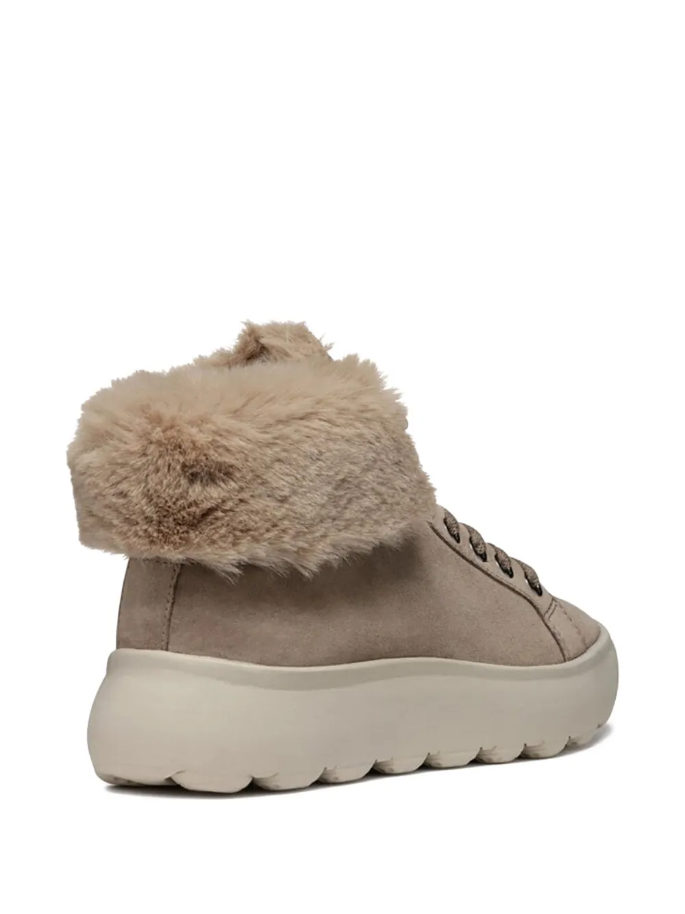 Верх из коричневой замши, манжеты из искусственного меха, шнуровка, подошва на платформе, круглый носок.