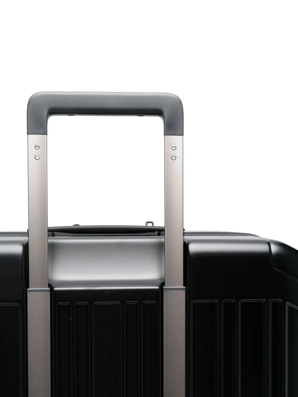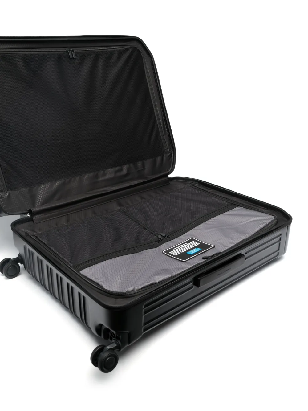Черный, лакированное покрытие, кодовый замок, серебристая фурнитура, круговая молния, верхняя ручка, плоская ручка сбоку, четыре колеса и несколько отделений.
