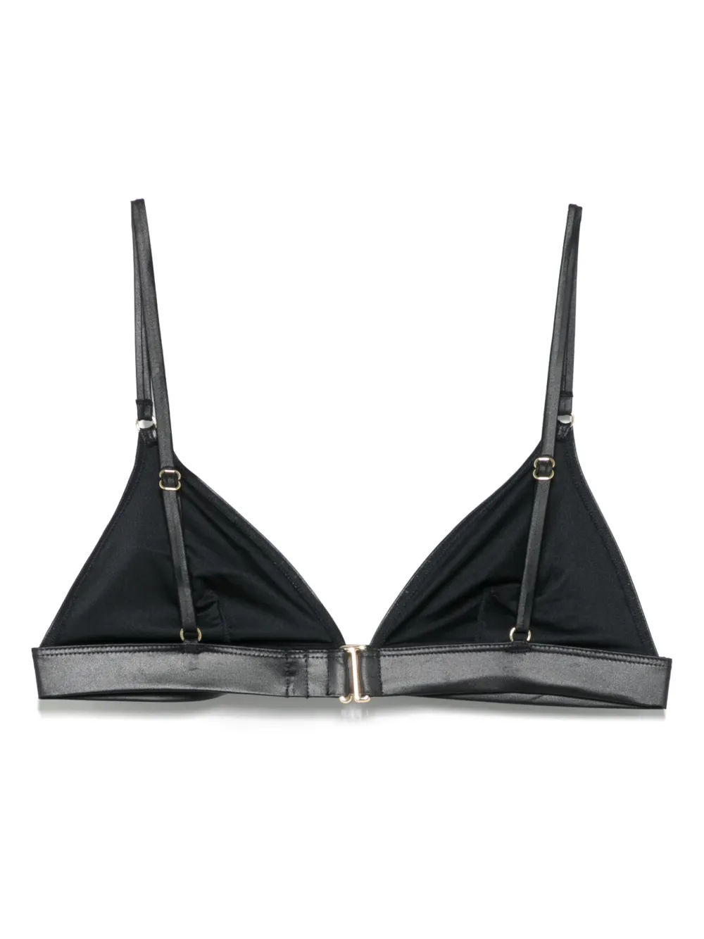 Черная застежка на крючок сзади, регулируемые лямки, треугольные чашечки.
