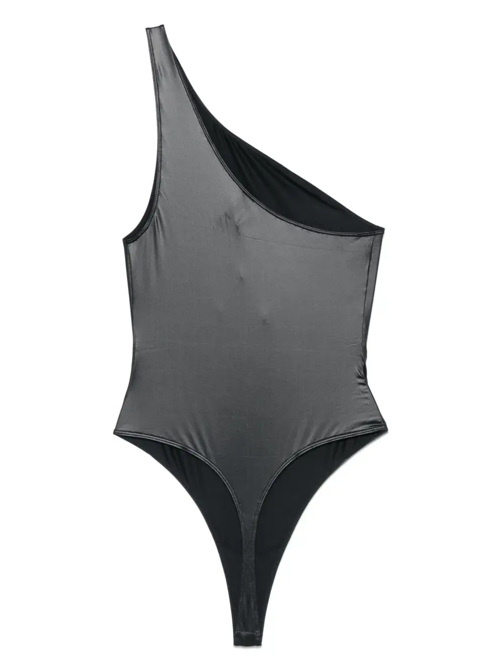 Черные асимметричные стринги на одно плечо. Обязательно примеряйте купальник поверх своей одежды.