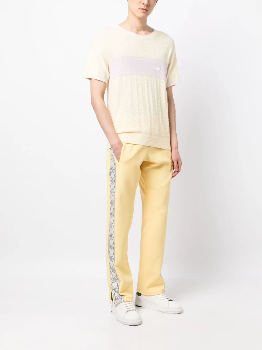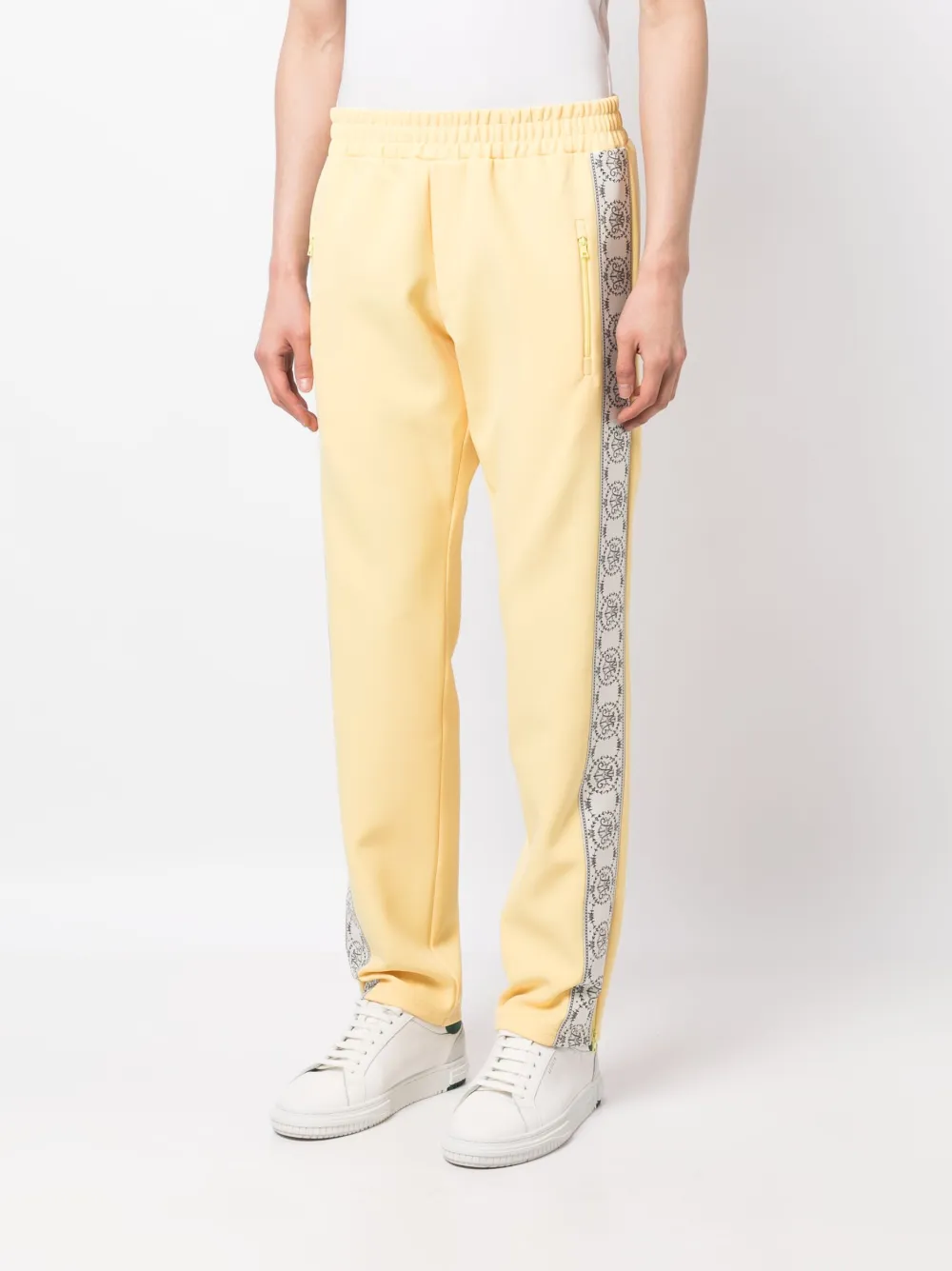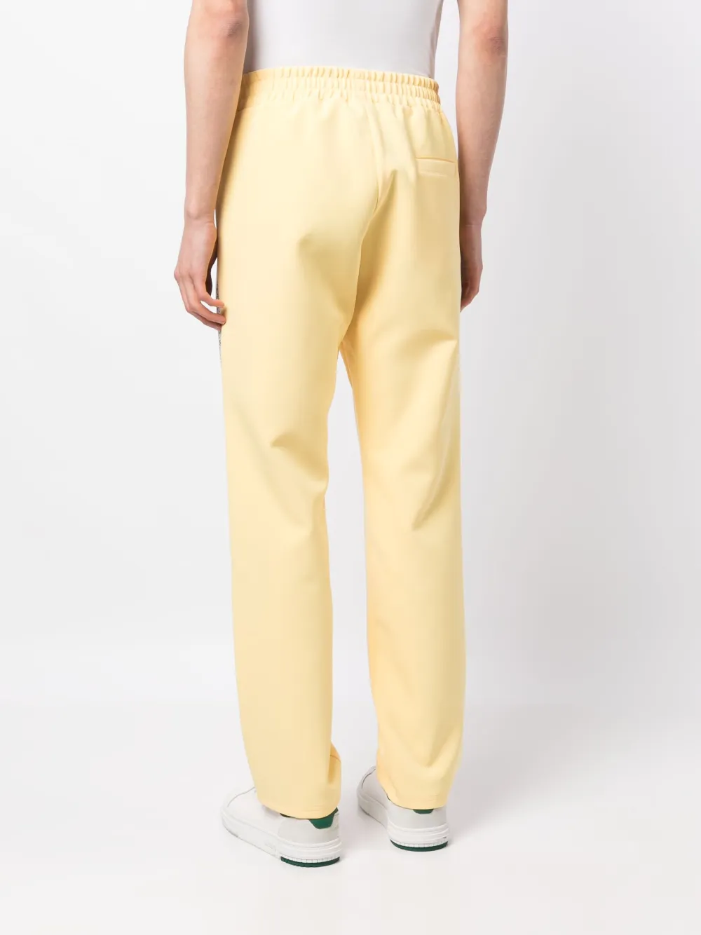 Бело-желтый, логотип сбоку, эластичный пояс, молнии на манжетах, прямой крой, два кармана на молнии по бокам и задние карманы с листочкой.