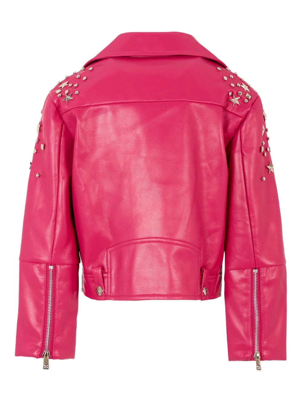 Застежка-молния в байкерском стиле цвета фуксии, украшения в виде звезд, металлические заклепки, длинные рукава.