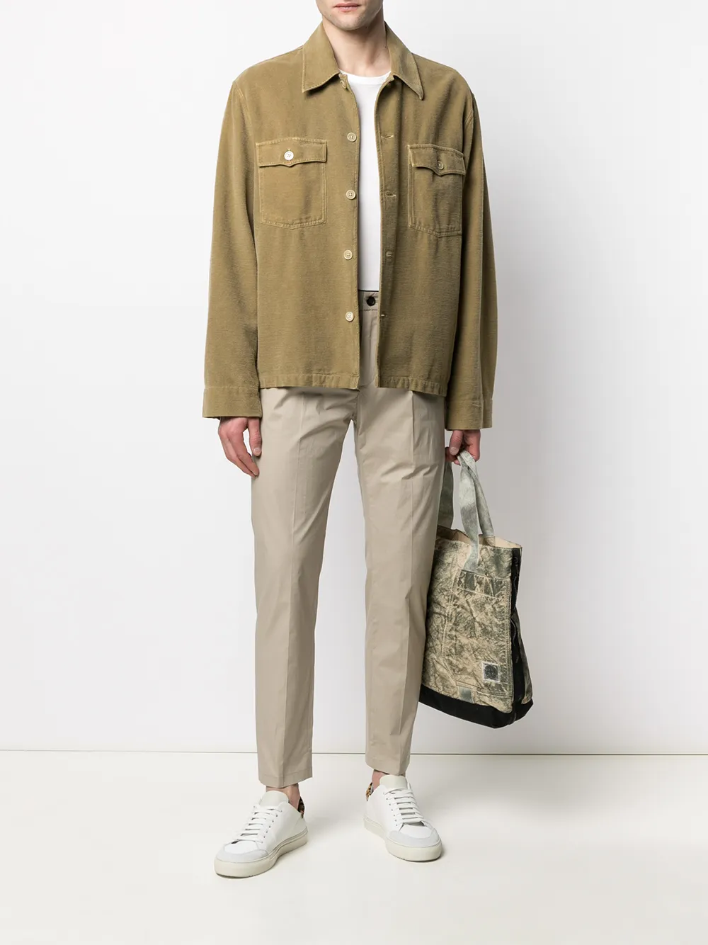 Ширинка на пуговицах, петли для ремня, прямой крой и два кармана с клапанами сзади.