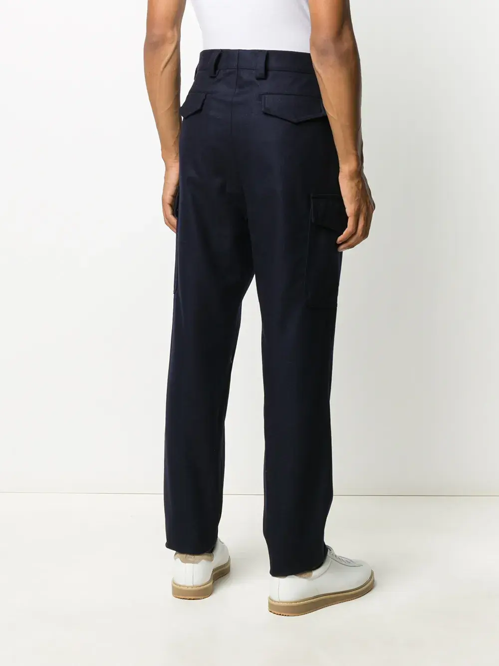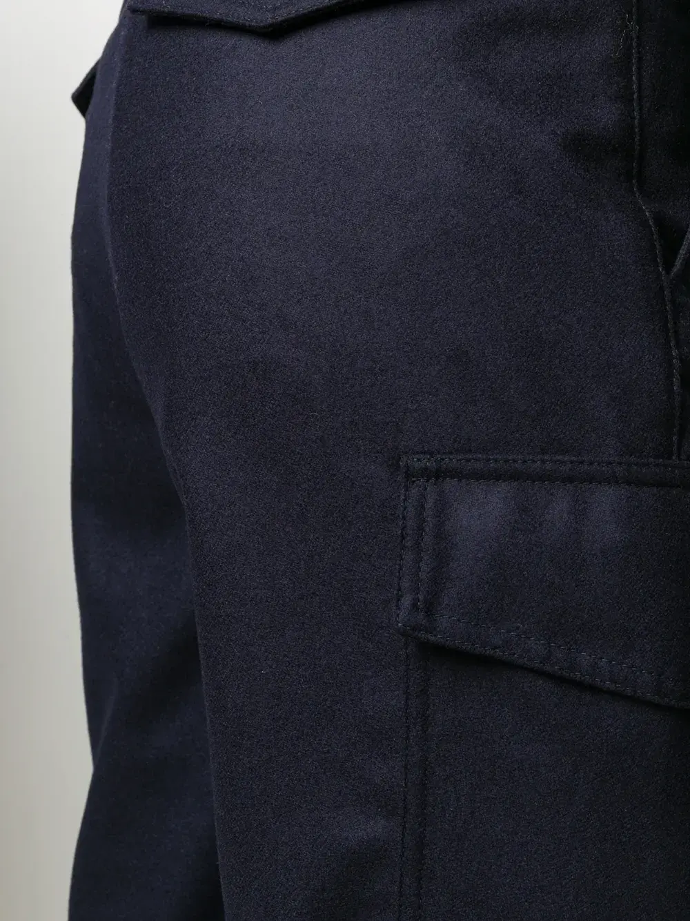 Петли для ремня, застежка на молнии и пуговице спереди, два кармана с клапанами по бокам, два кармана с клапанами сзади и прямой крой. Цвет: синий.