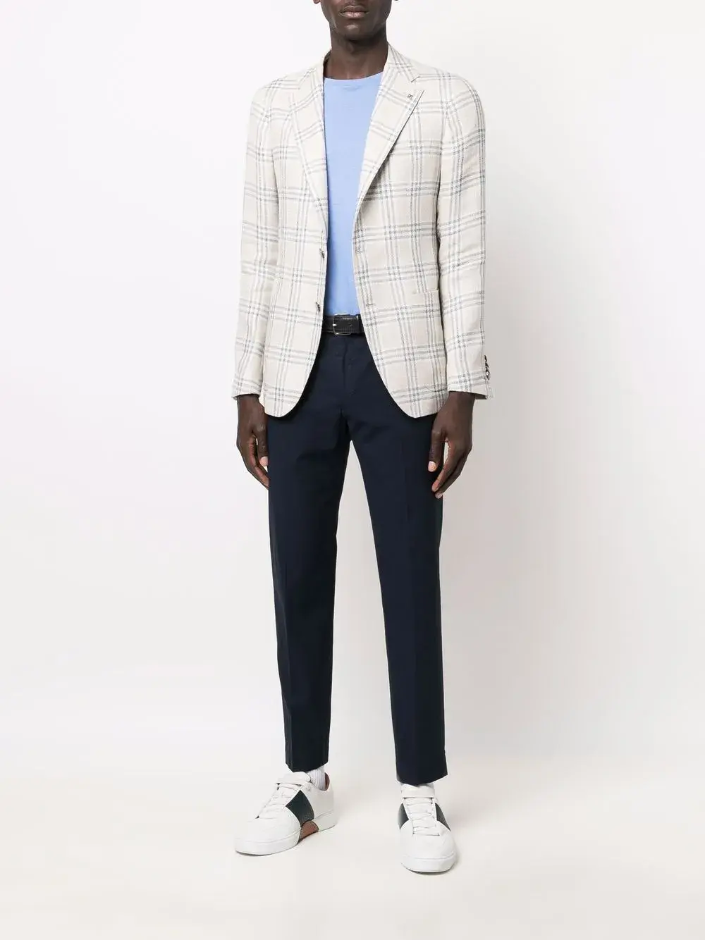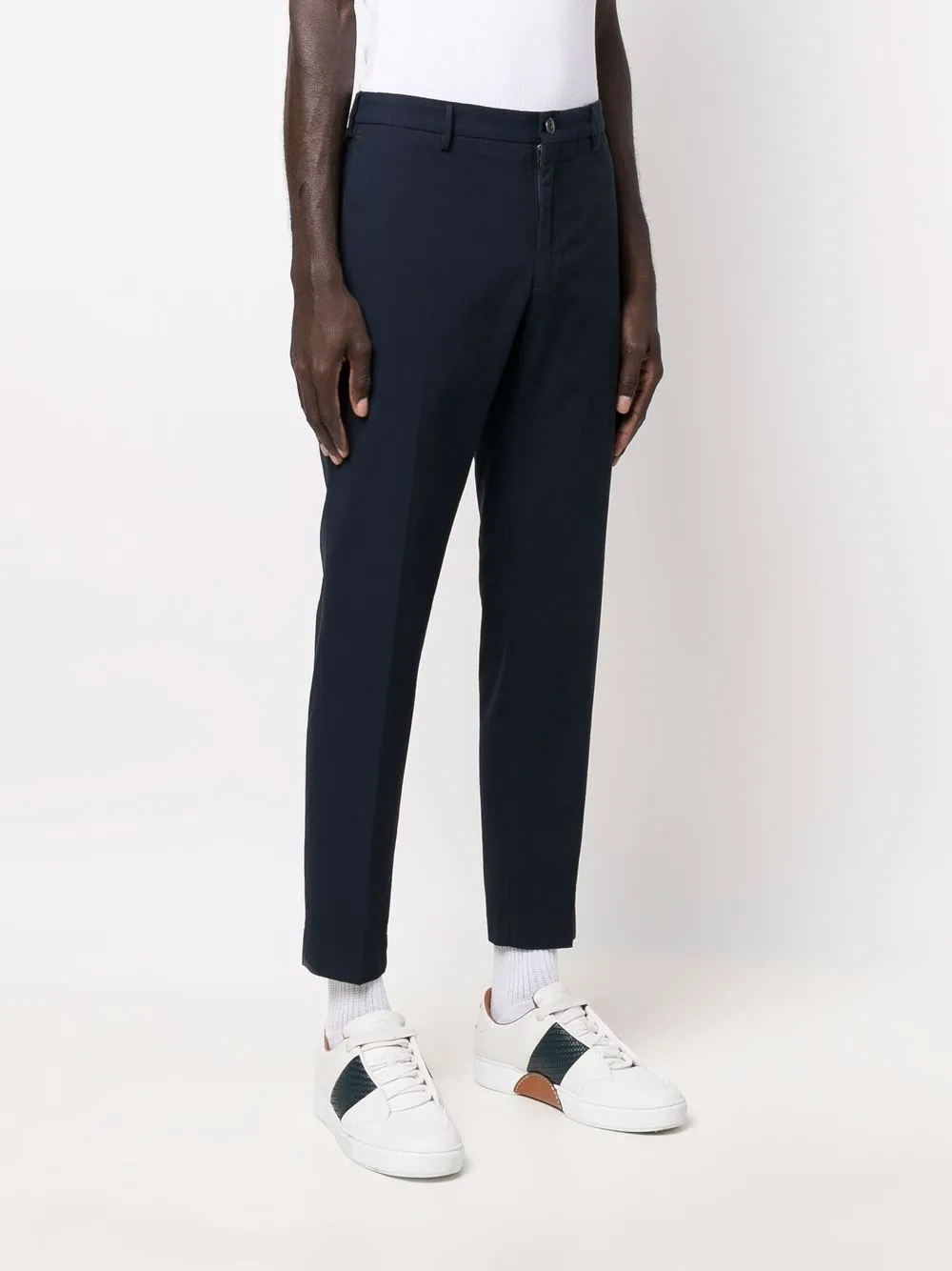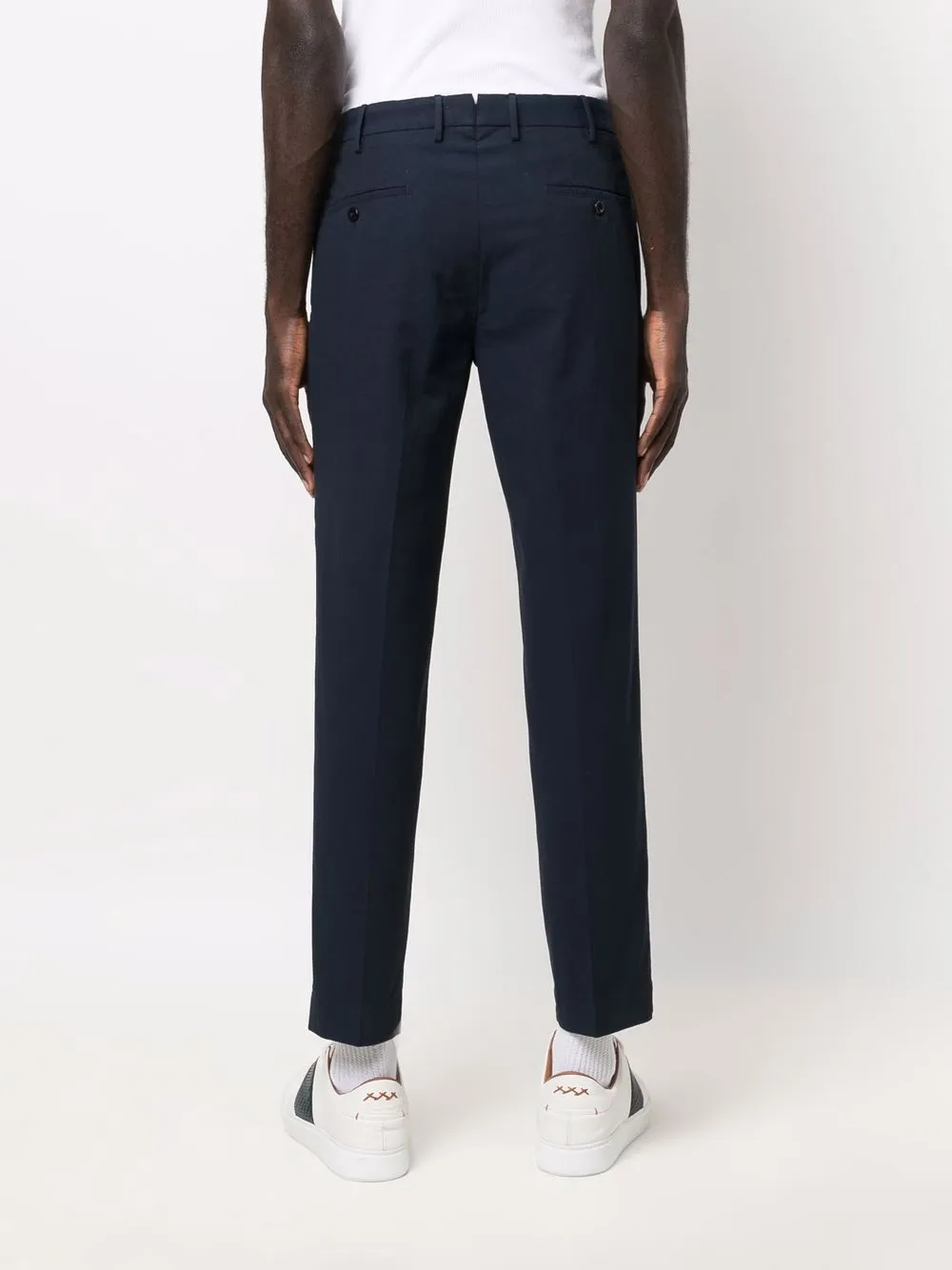 Прямой крой, петли для ремня, застежка на молнии и пуговице спереди, прорезные карманы по бокам и два кармана с листочкой сзади.