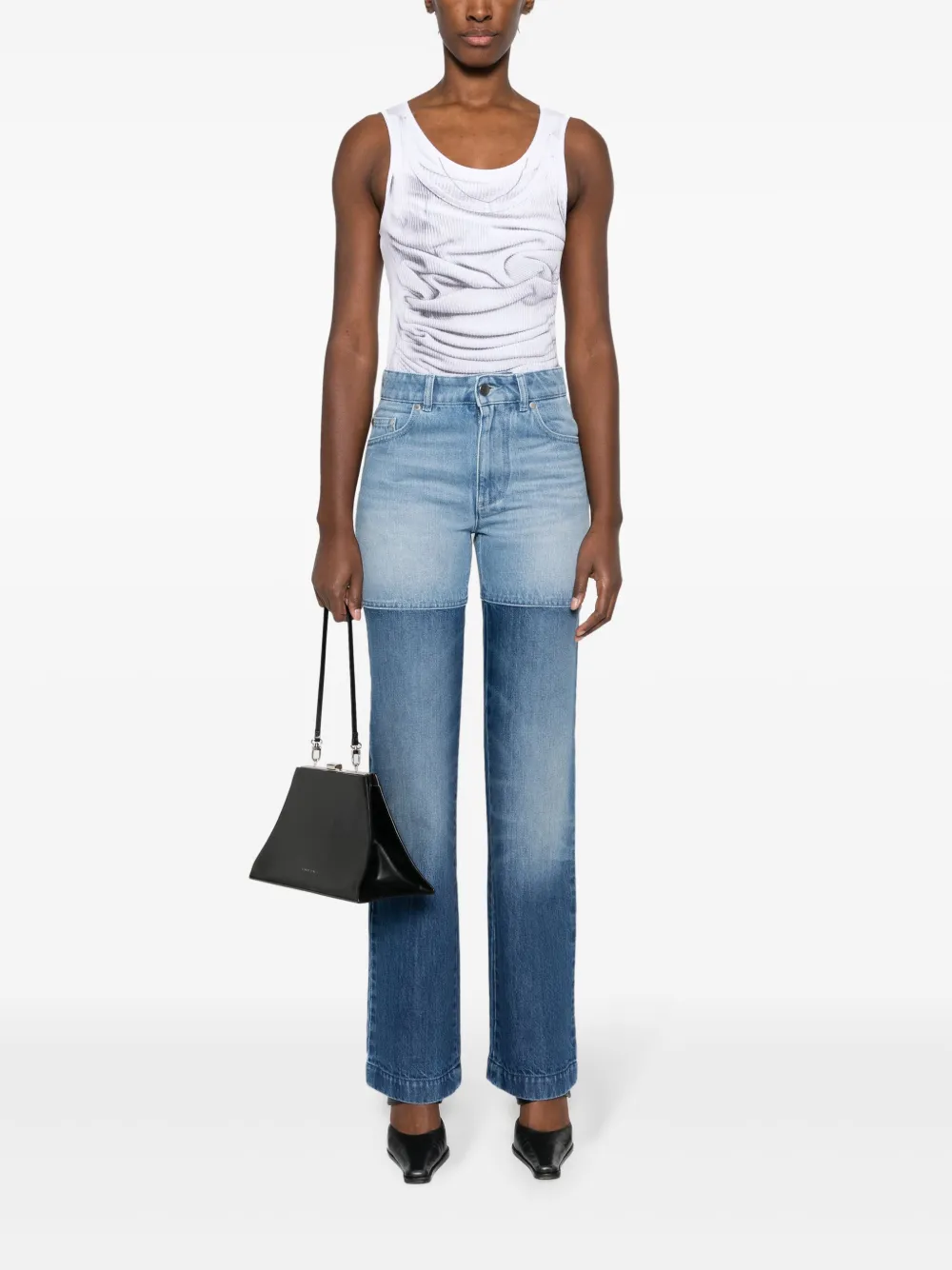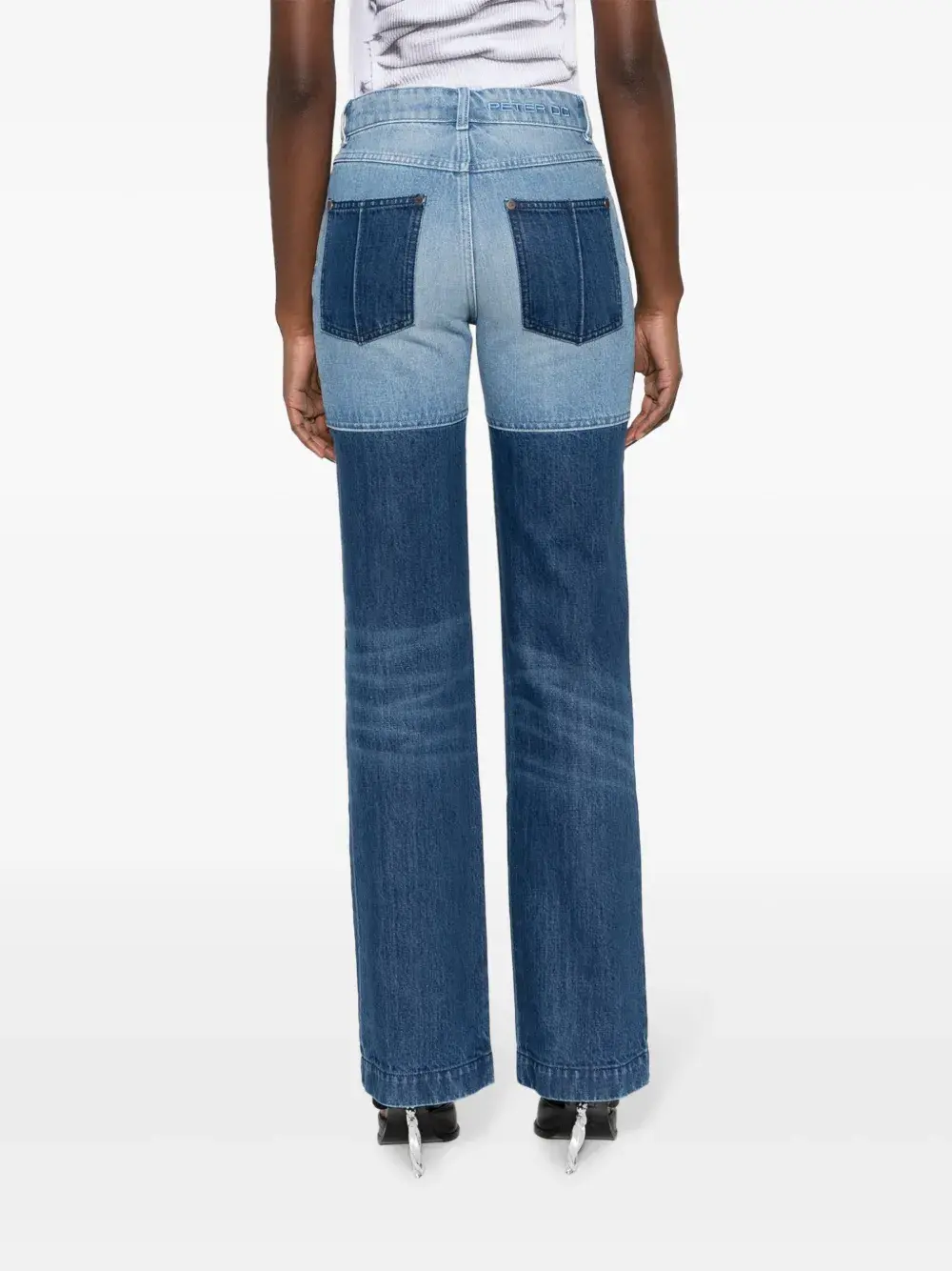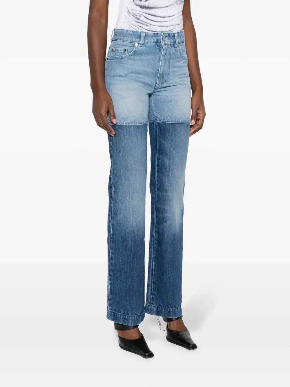Синий, хлопок, градиентный эффект, пять карманов, петли для ремня, прямой подол, потайная застежка на молнии и пуговицах и прямой крой.
