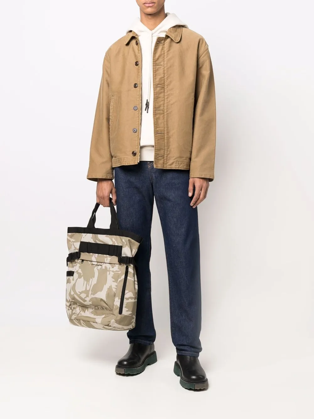 Прямой крой, застежка на пуговицах спереди, два кармана по бокам и два накладных кармана сзади.