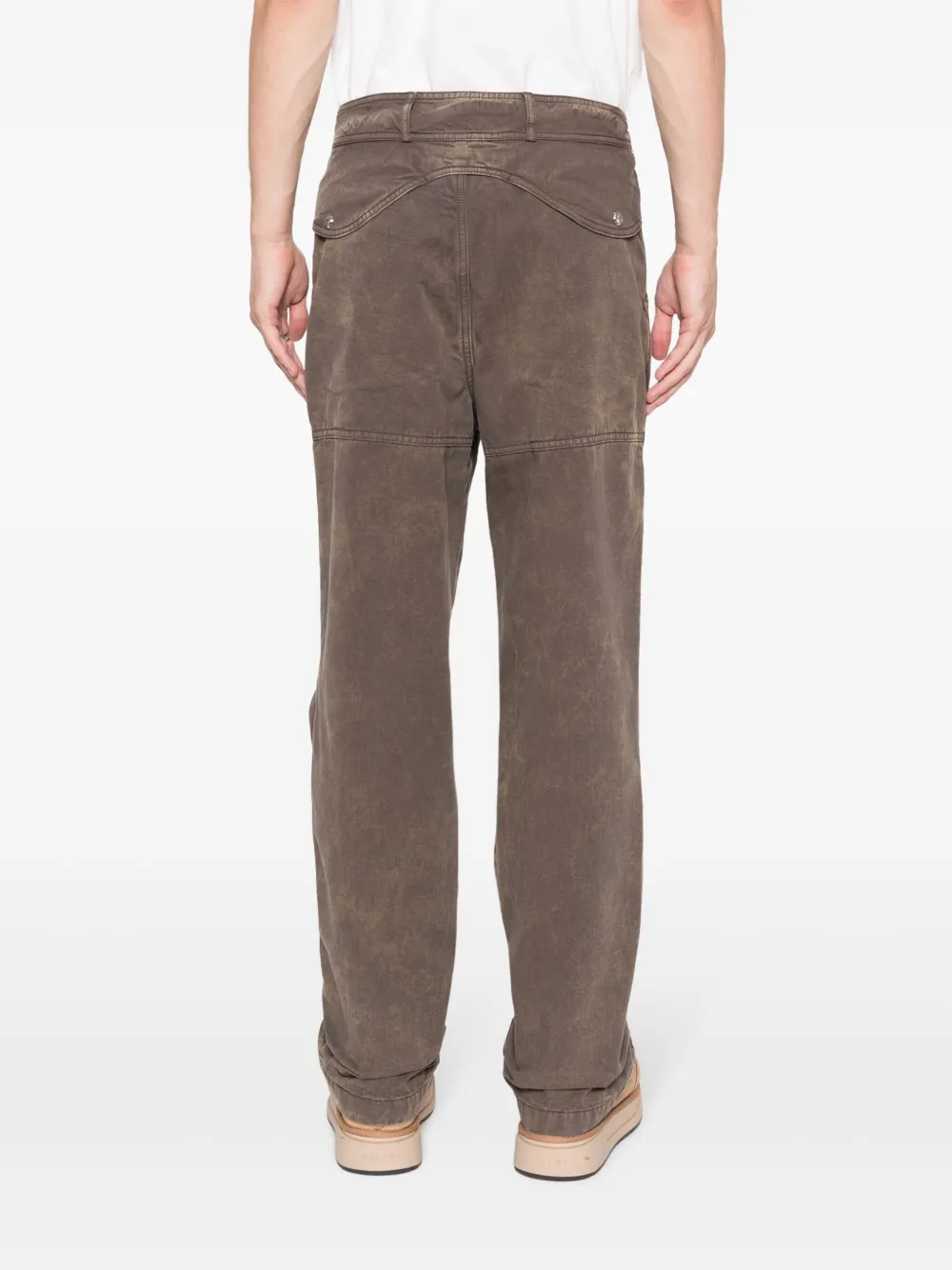Миндальный, хлопок, обработанный деним, эффект потертости, детали с молниями, средняя посадка, потайная застежка на молнии и пуговицах, петли для ремня, два прорезных кармана по бокам, два кармана с клапанами сзади, прямой крой и молнии на манжетах.