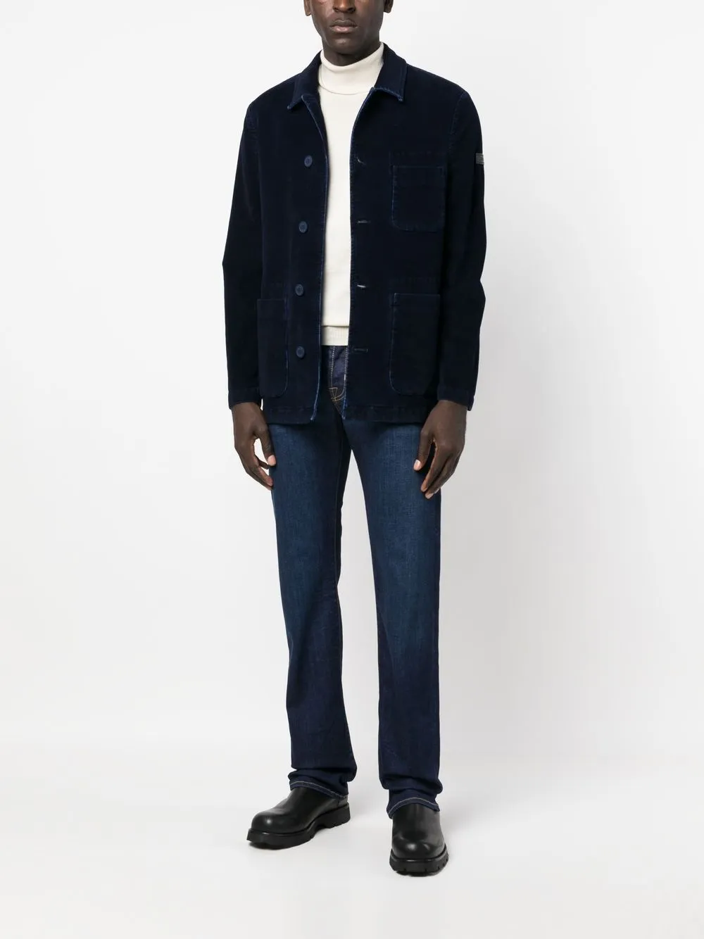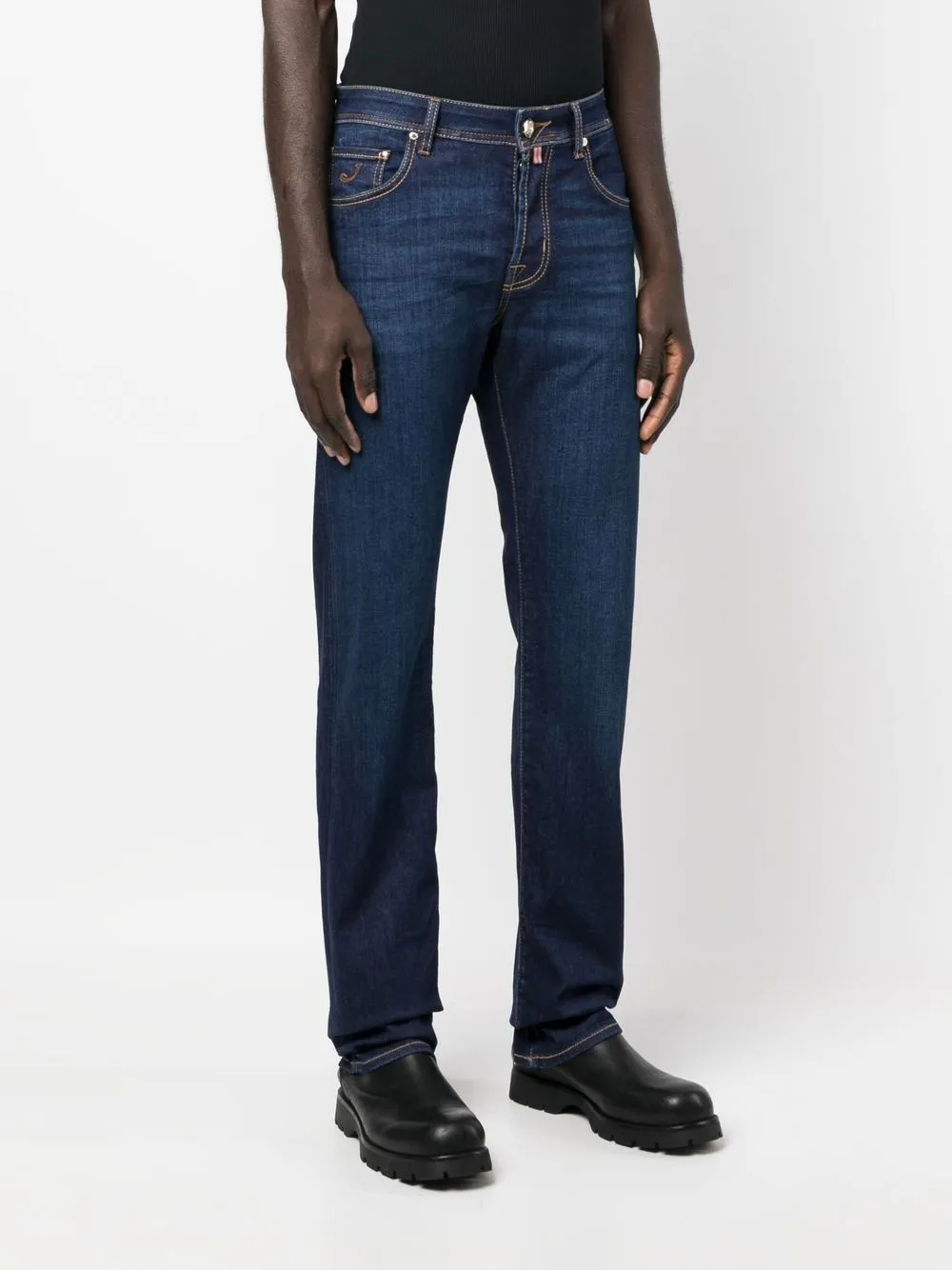 Индиго смесовый хлопок контрастная строчка вышитый логотип спереди нашивка с логотипом сзади петли для ремня застежка на молнии и пуговице спереди пять карманов прямой крой Обратите внимание, что мы не сможем отправить этот товар за пределы ЕС и Великобритании.