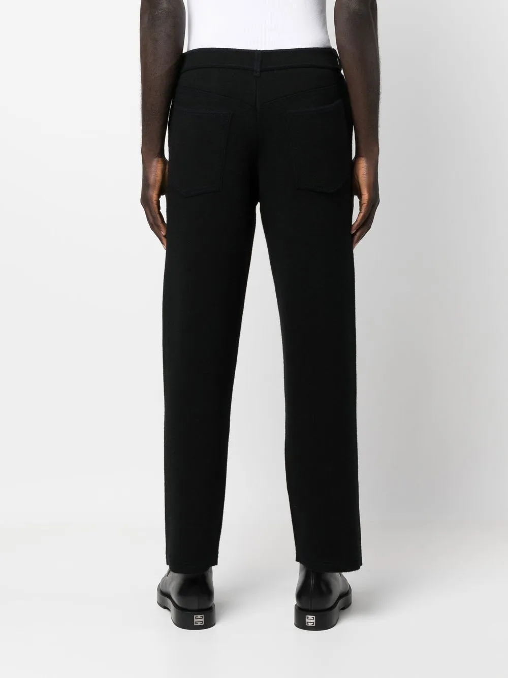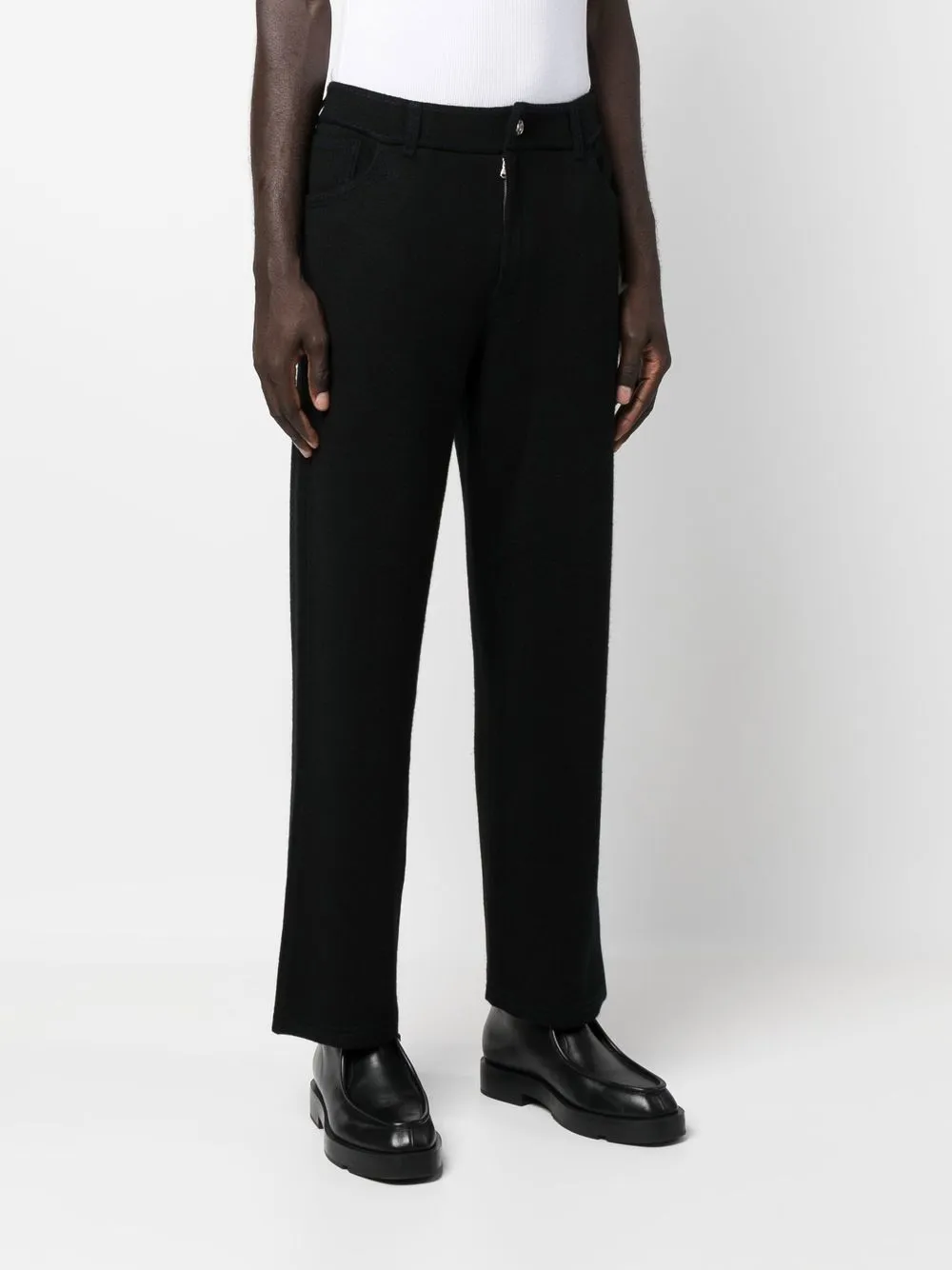 Прямой крой, петли для ремня, застежка на молнии и пуговице спереди и пять карманов.