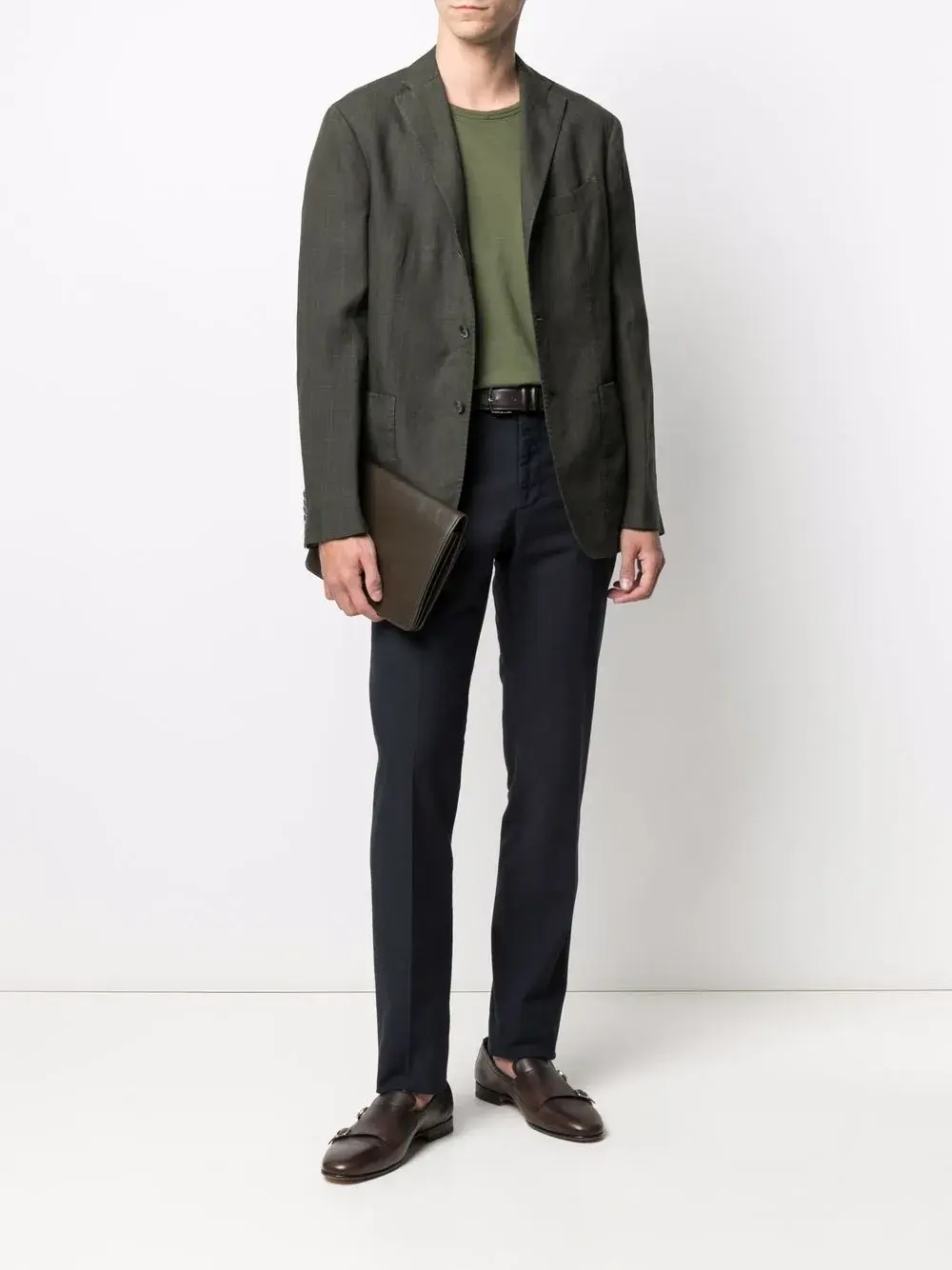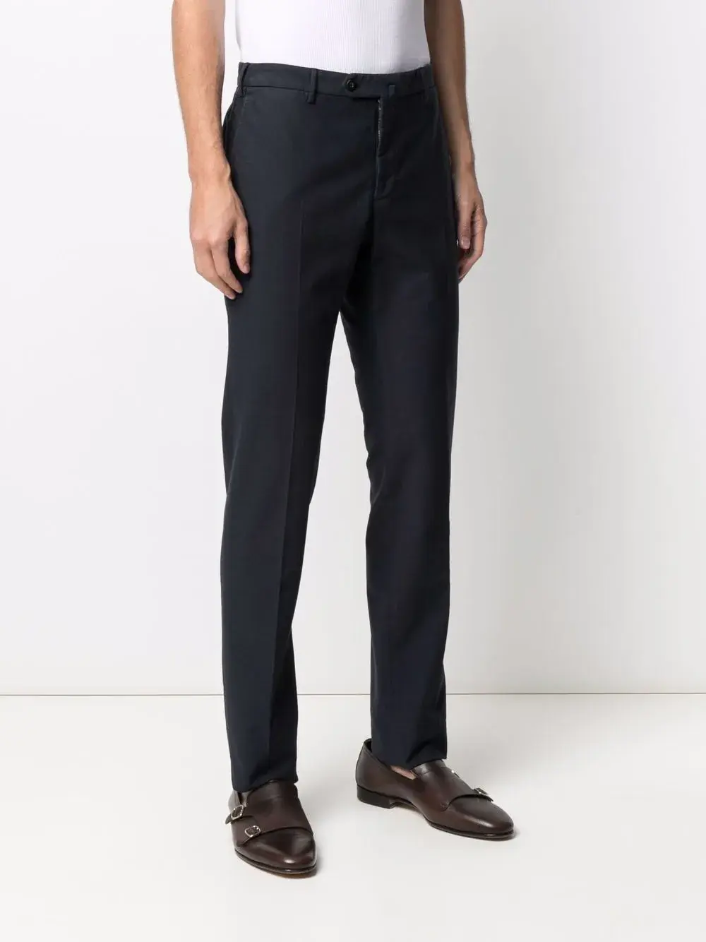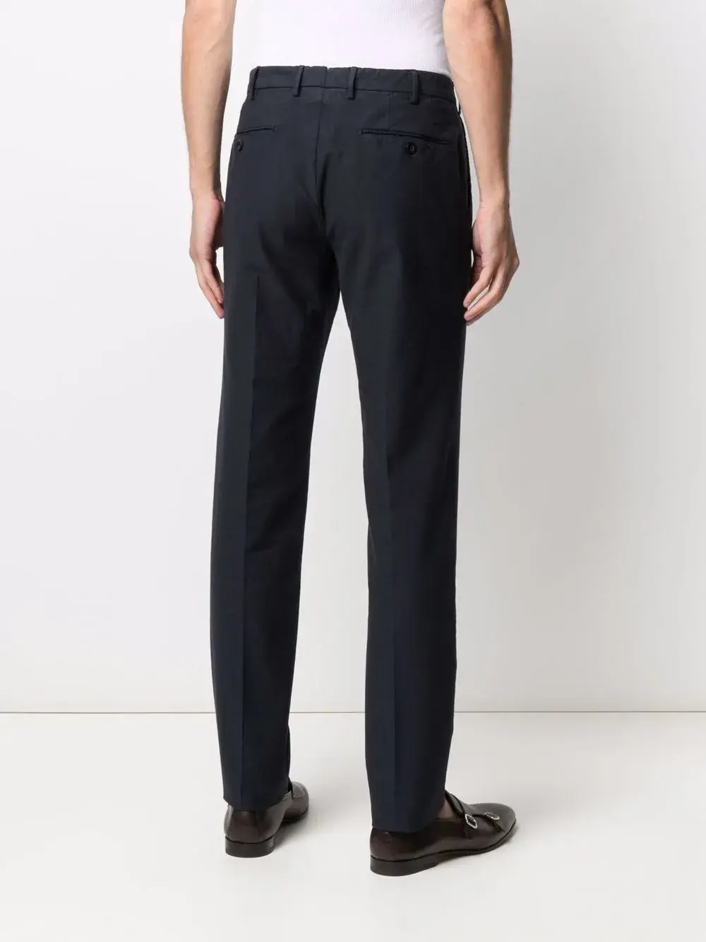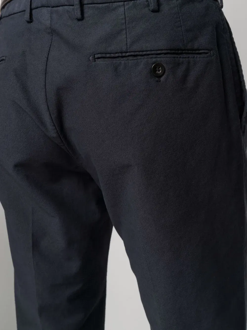 Застежка на пуговицах спереди, петли для ремня, два кармана с листочкой сзади и прямой крой.