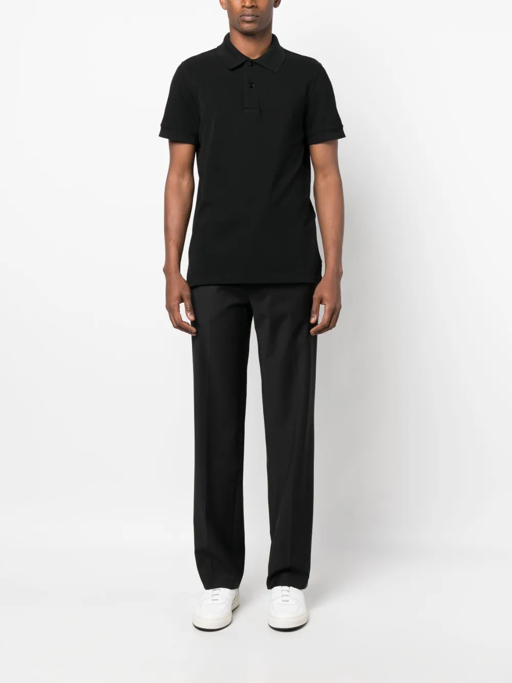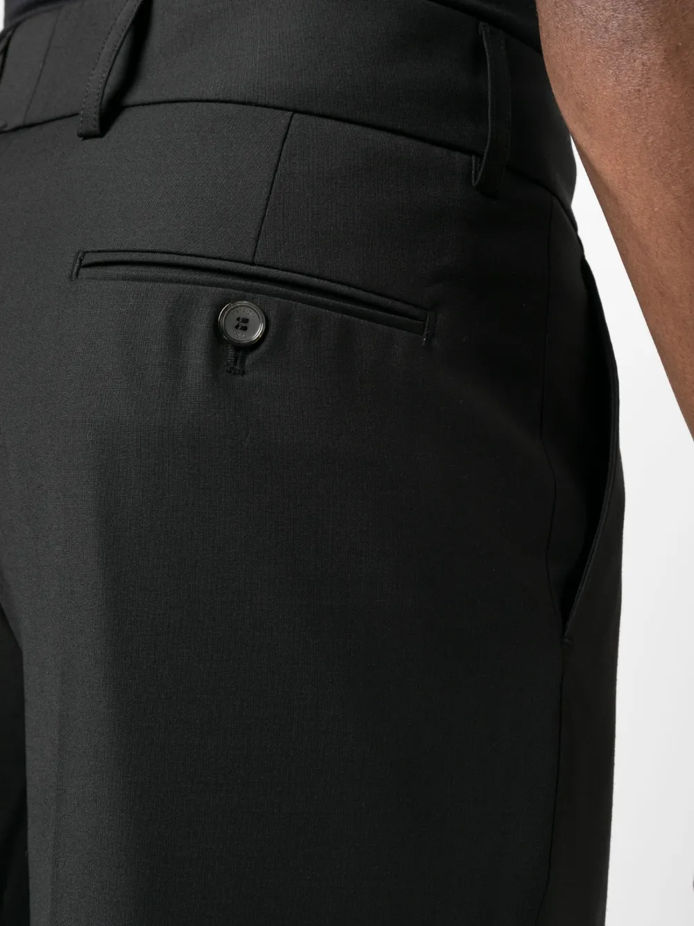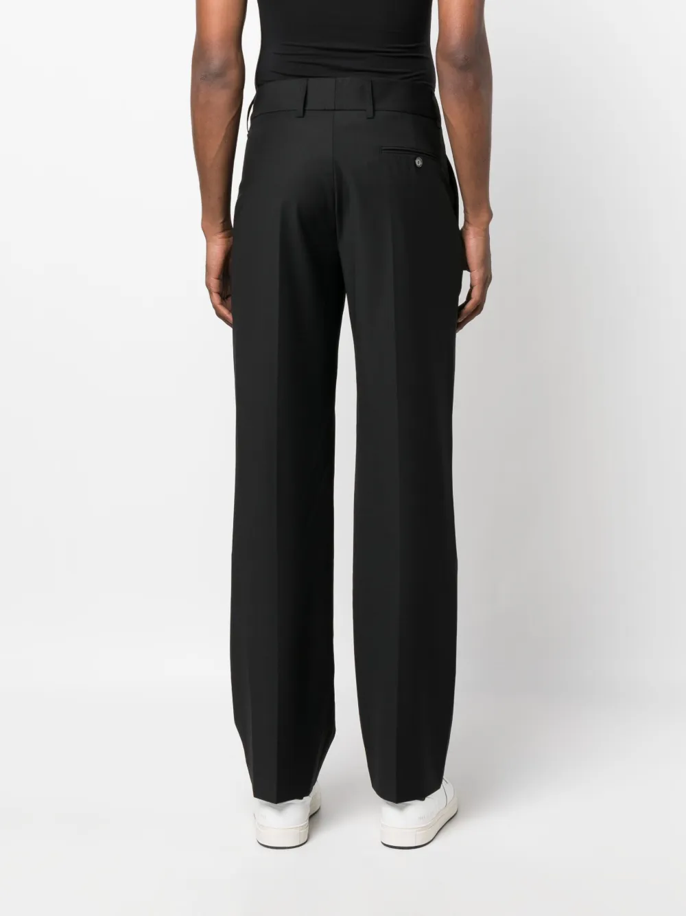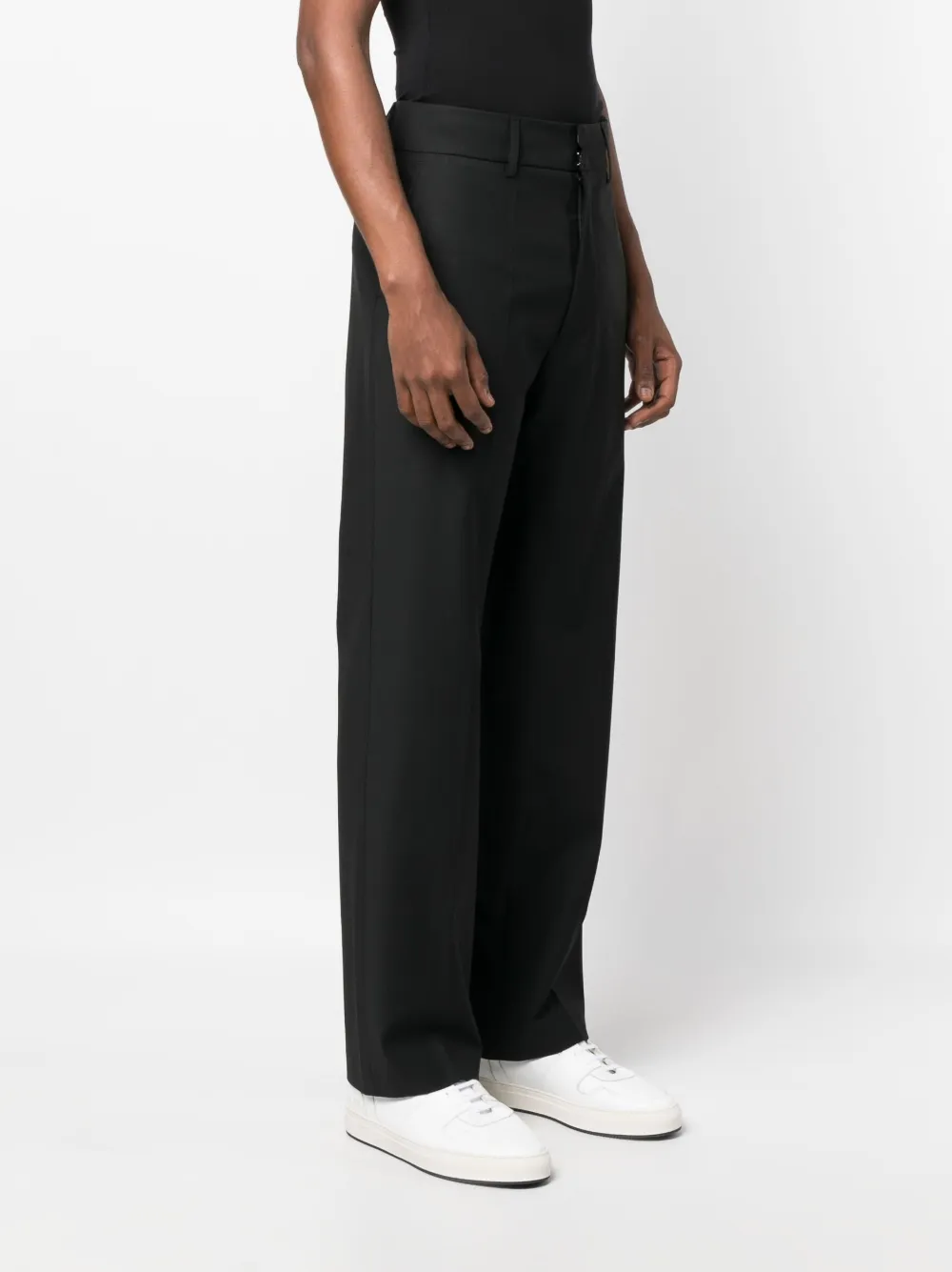 Черный, хлопок, классический крой, петли для ремня, стрелки, потайная застежка спереди, прямой крой, два вшитых кармана по бокам и два прорезных кармана на пуговицах сзади.