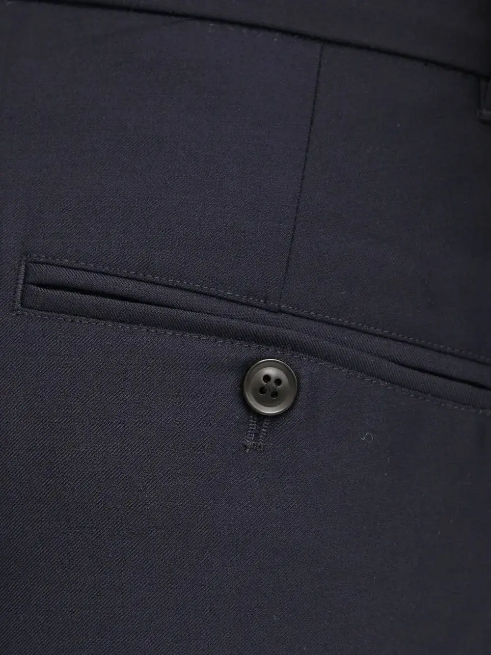 Темно-синие складки спереди, застежка на пуговицы сзади, прорезные карманы, прямой брючины