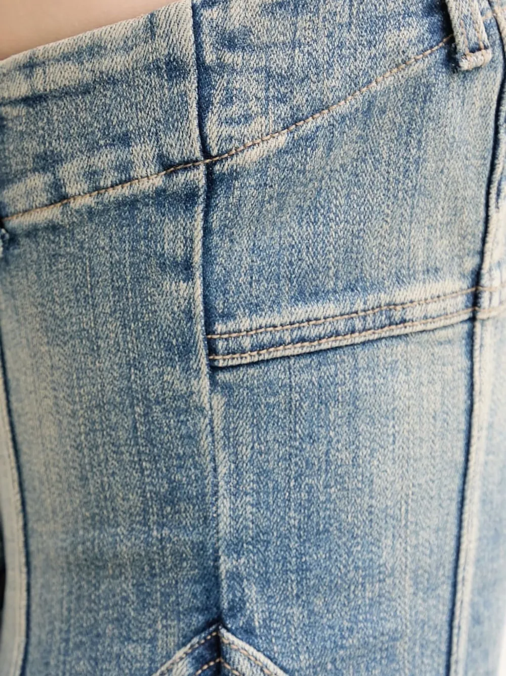 Юбка А-силуэта из светло-голубой джинсовой ткани с прямым вырезом и детальным швом.