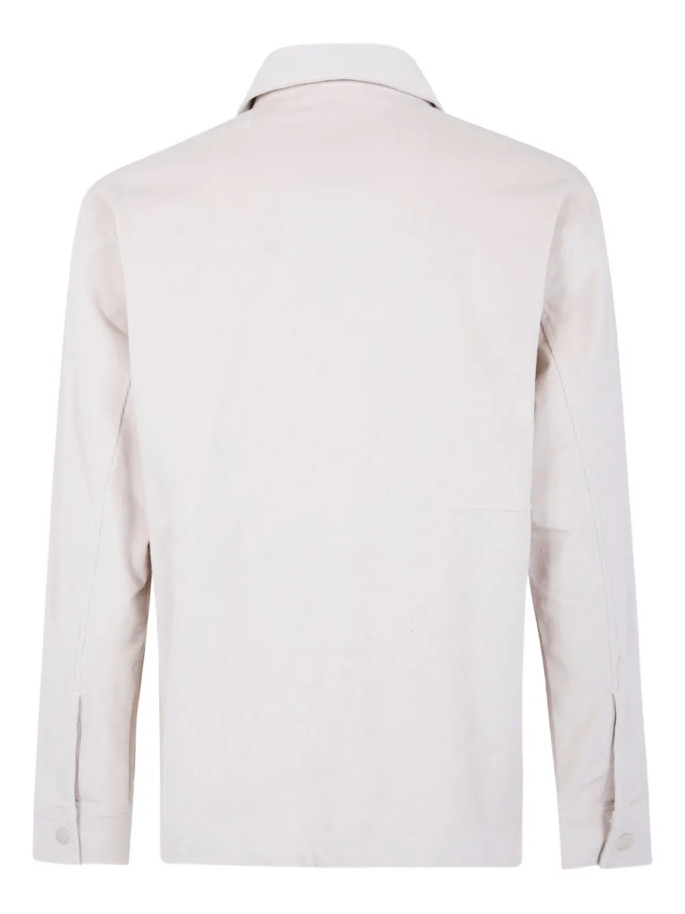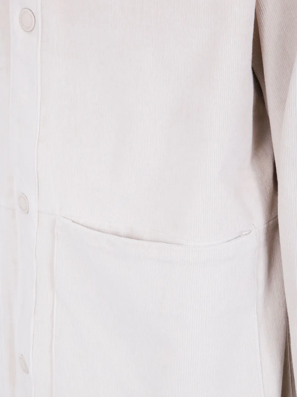 Серая вельветовая текстура, застежка на пуговицы, накладные карманы, длинные рукава, воротник-стойка.