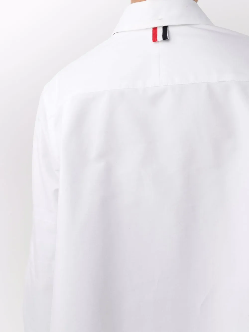 Полоски 4-Bar, бант, нашивка с логотипом спереди, фирменная деталь в полоску, классический воротник, нагрудный накладной карман, планка на пуговицах спереди, длинные рукава, манжеты на пуговицах и неравномерный подол. Цвет: белый.