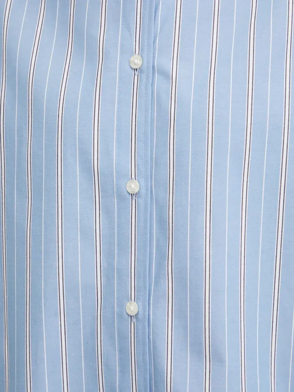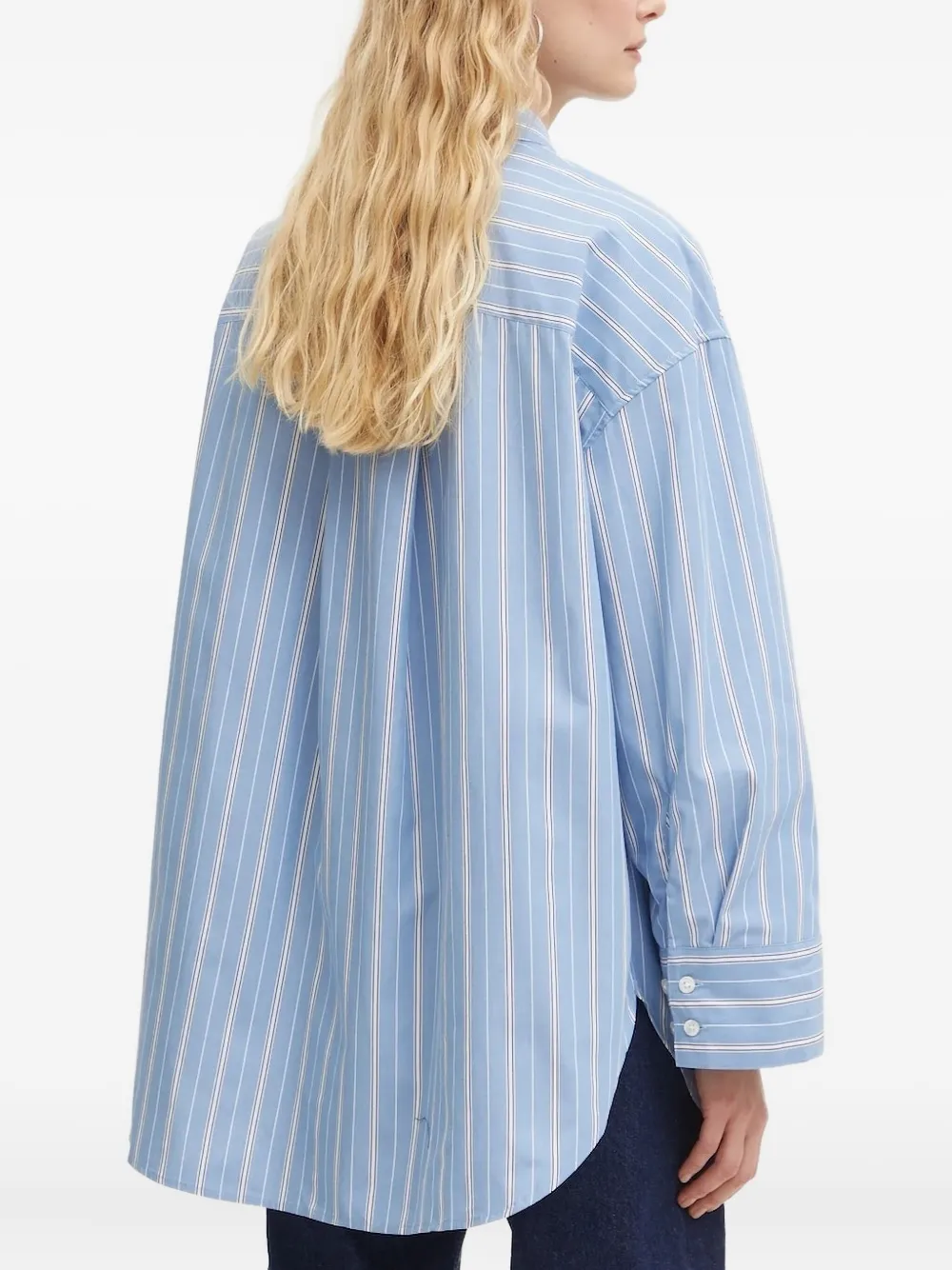 Синие вертикальные полосы, застежка на пуговицы спереди, длинные рукава, широкие манжеты.