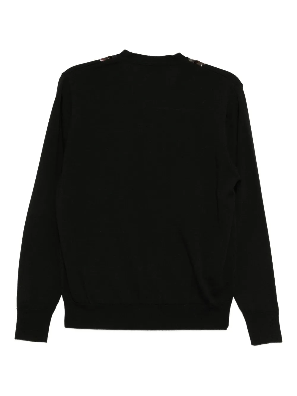 Черная застежка на пуговицы спереди, два боковых прорезных кармана, ребристые манжеты и подол.