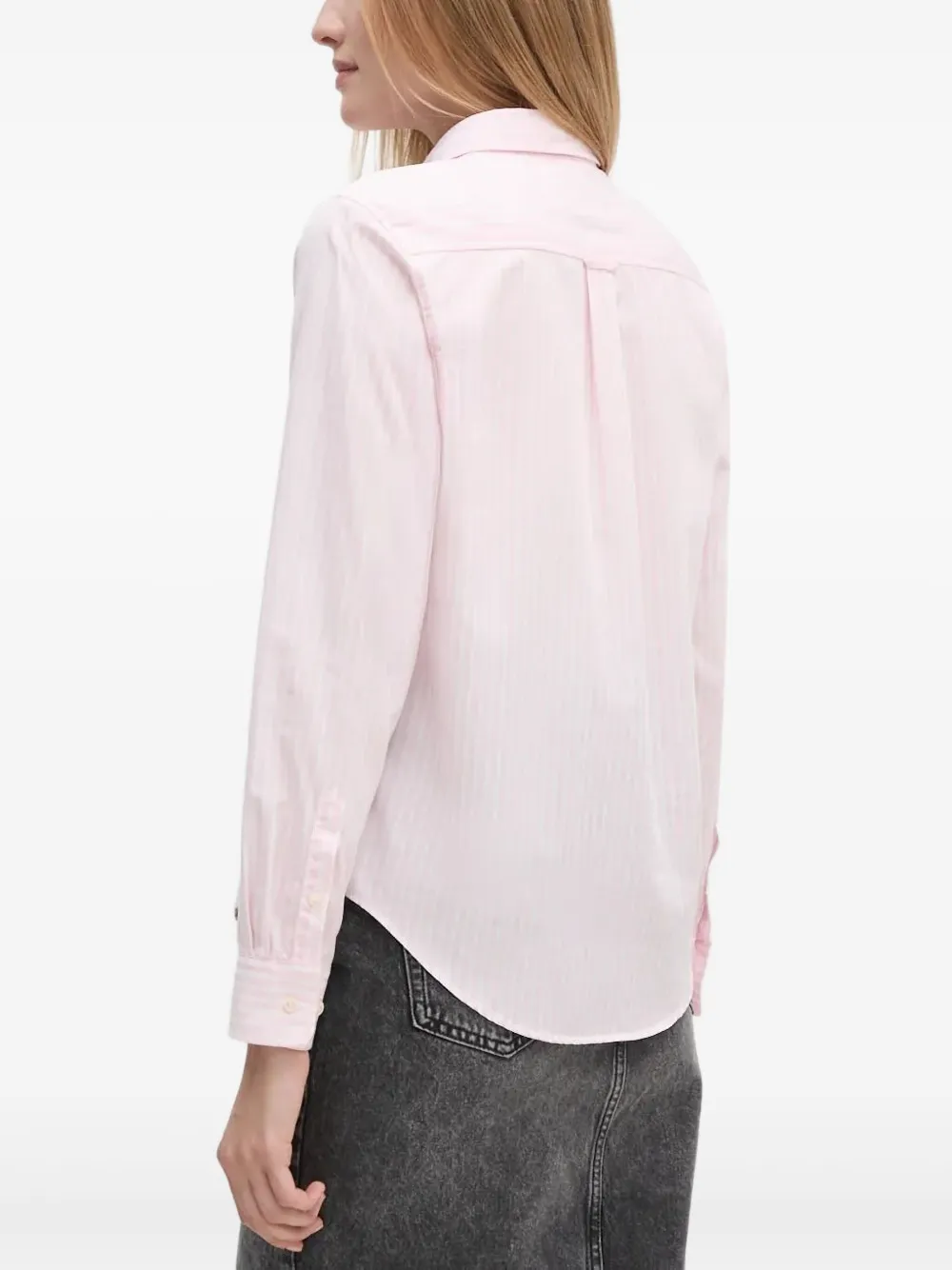 Розовый хлопковый полосатый узор, застежка на пуговицы, длинные рукава, классический воротник, закругленный подол.