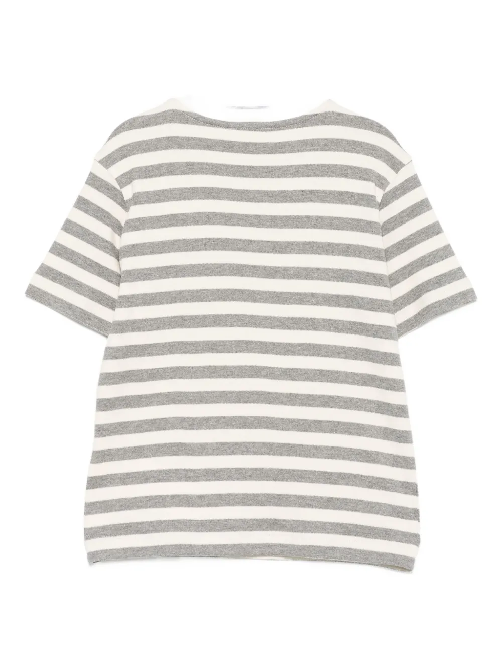 Горизонтальные полосы цвета слоновой кости и серого цвета, короткие рукава, круглый вырез горловины, вышитый логотип, хлопок
