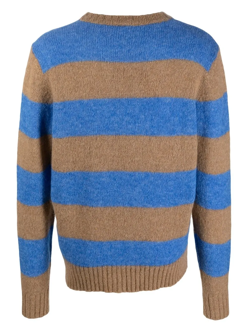 Расцветка Light Brown, расцветка Ocean Blue, смесь мохера и шерсти, вязаные края в рубчик, узор в горизонтальную полоску, нашивка с логотипом на груди, круглый вырез, длинные рукава и прямой подол.