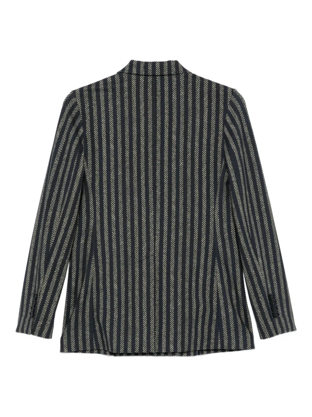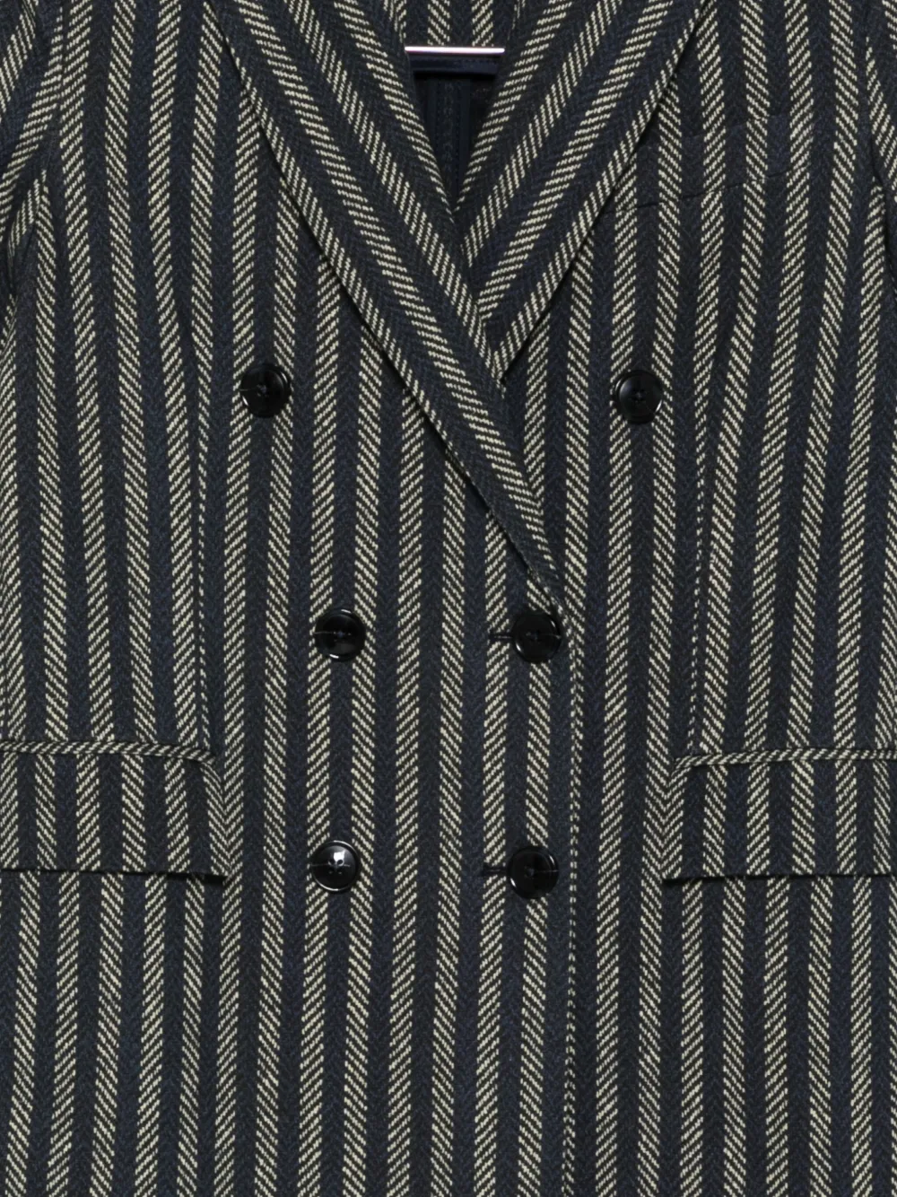 Серый полосатый рисунок, двубортная застежка, отложной воротник, длинные рукава, прорезные карманы.