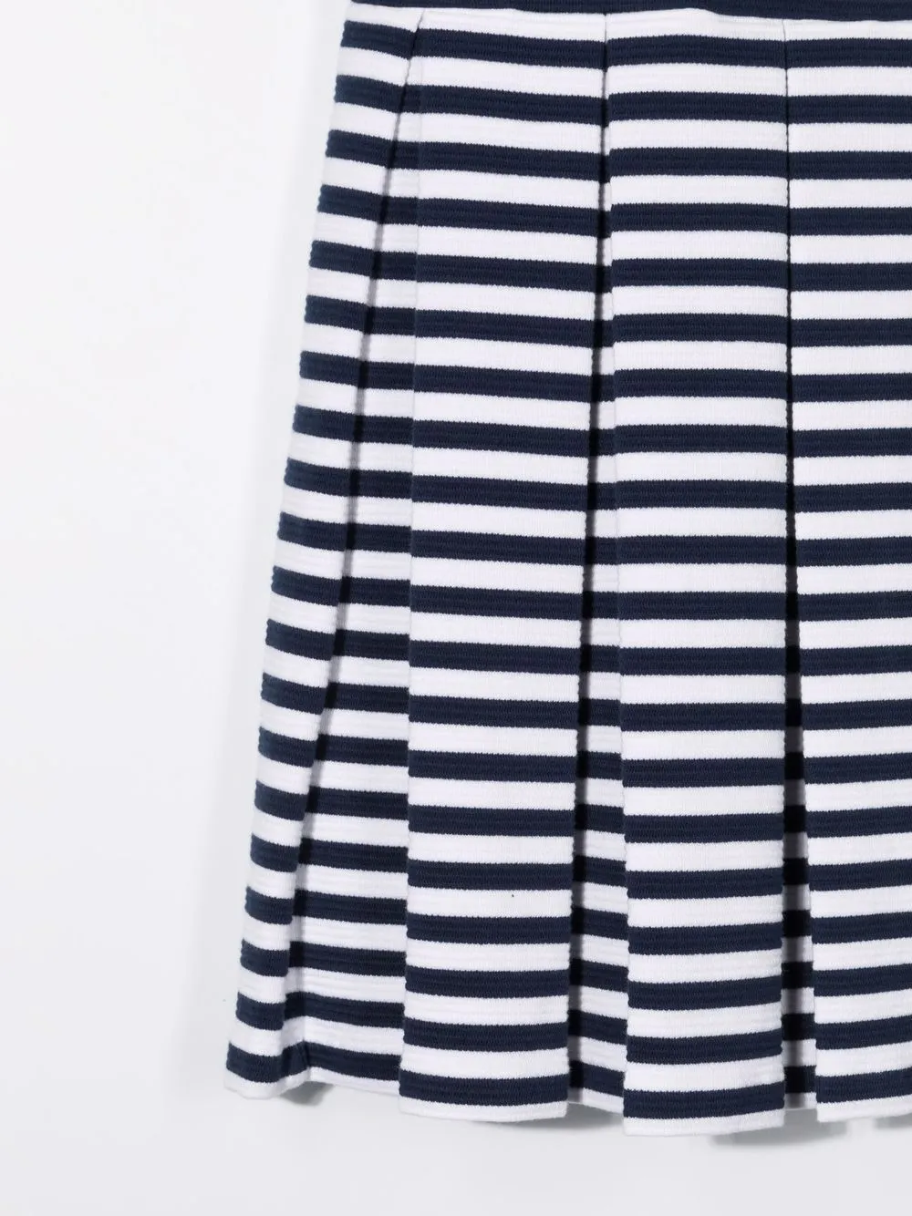 Узор в горизонтальную полоску, круглый вырез, короткие рукава и плиссированная юбка.