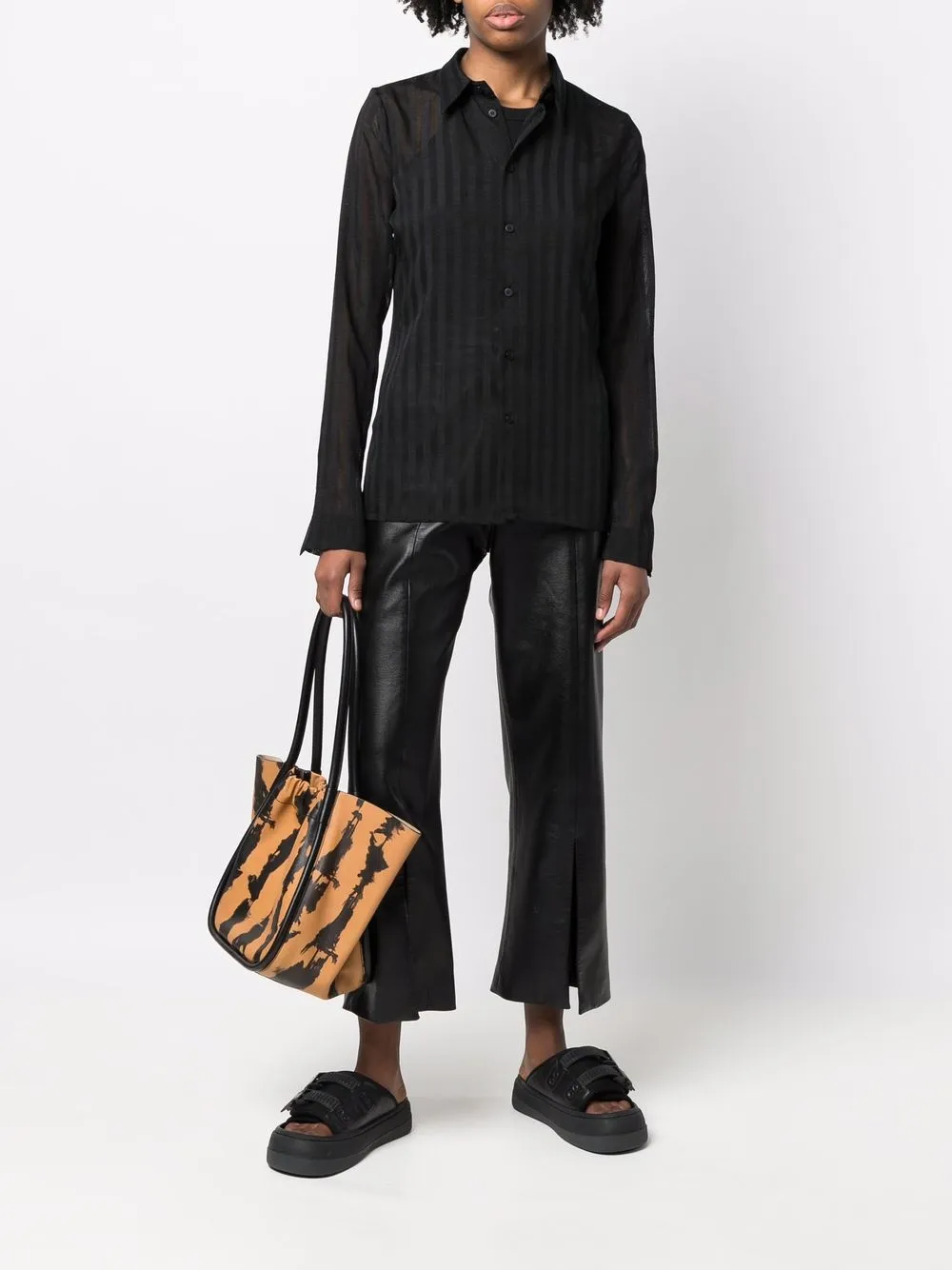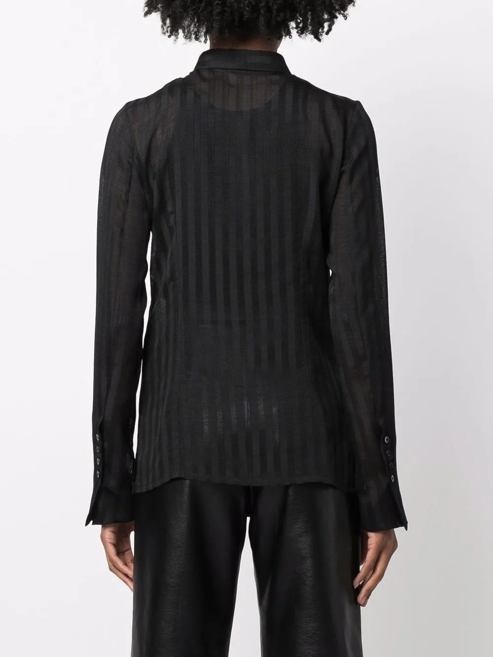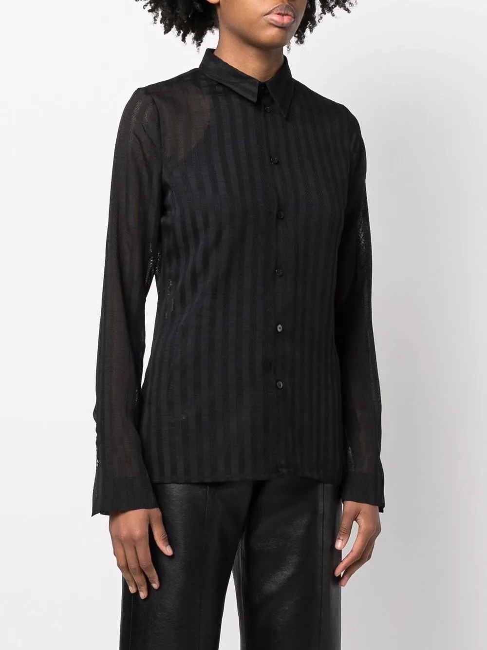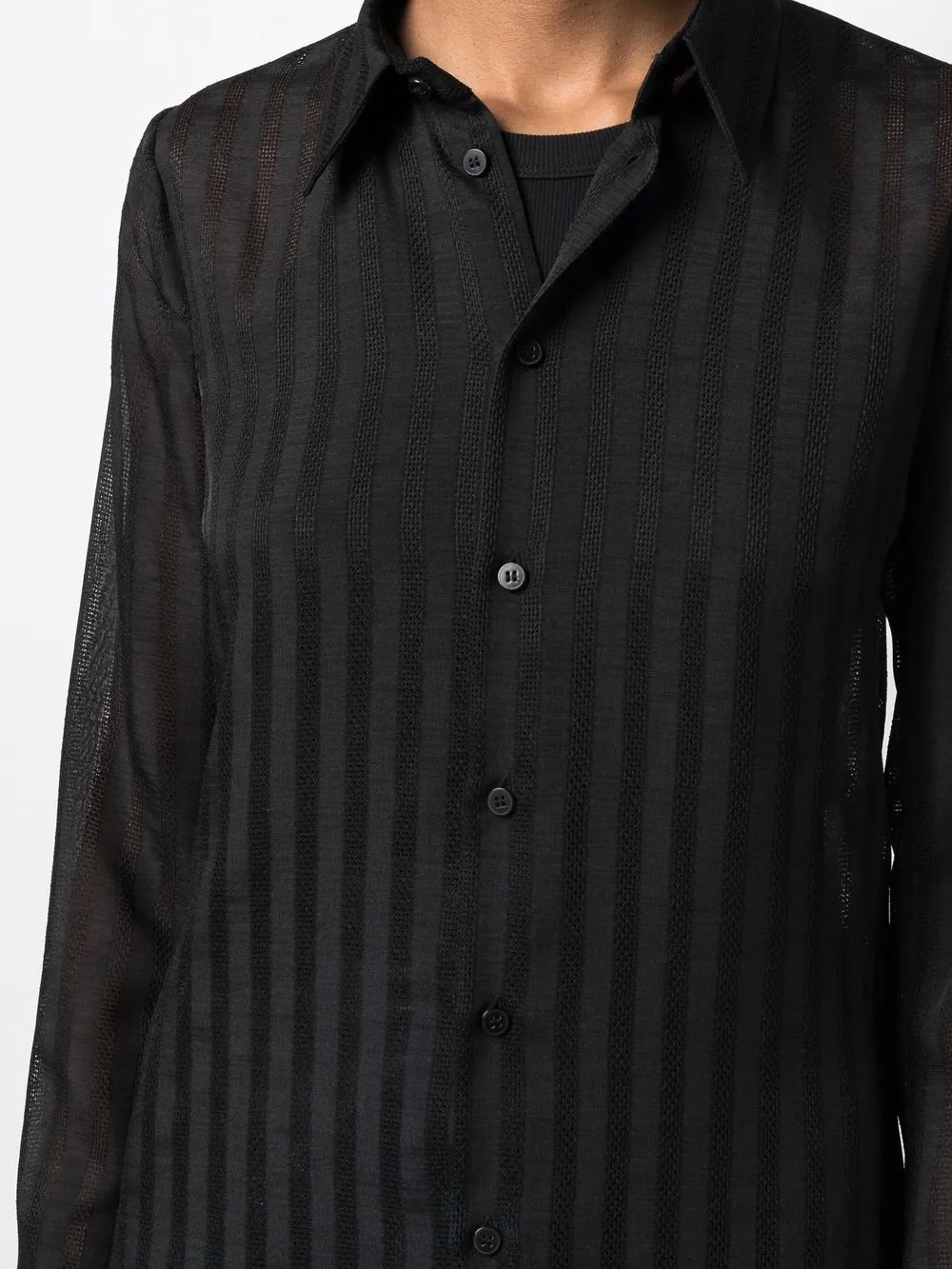 Полупрозрачный дизайн, узор в вертикальную полоску, классический воротник, застежка на пуговицах спереди, длинные рукава, манжеты на пуговицах и прямой подол.