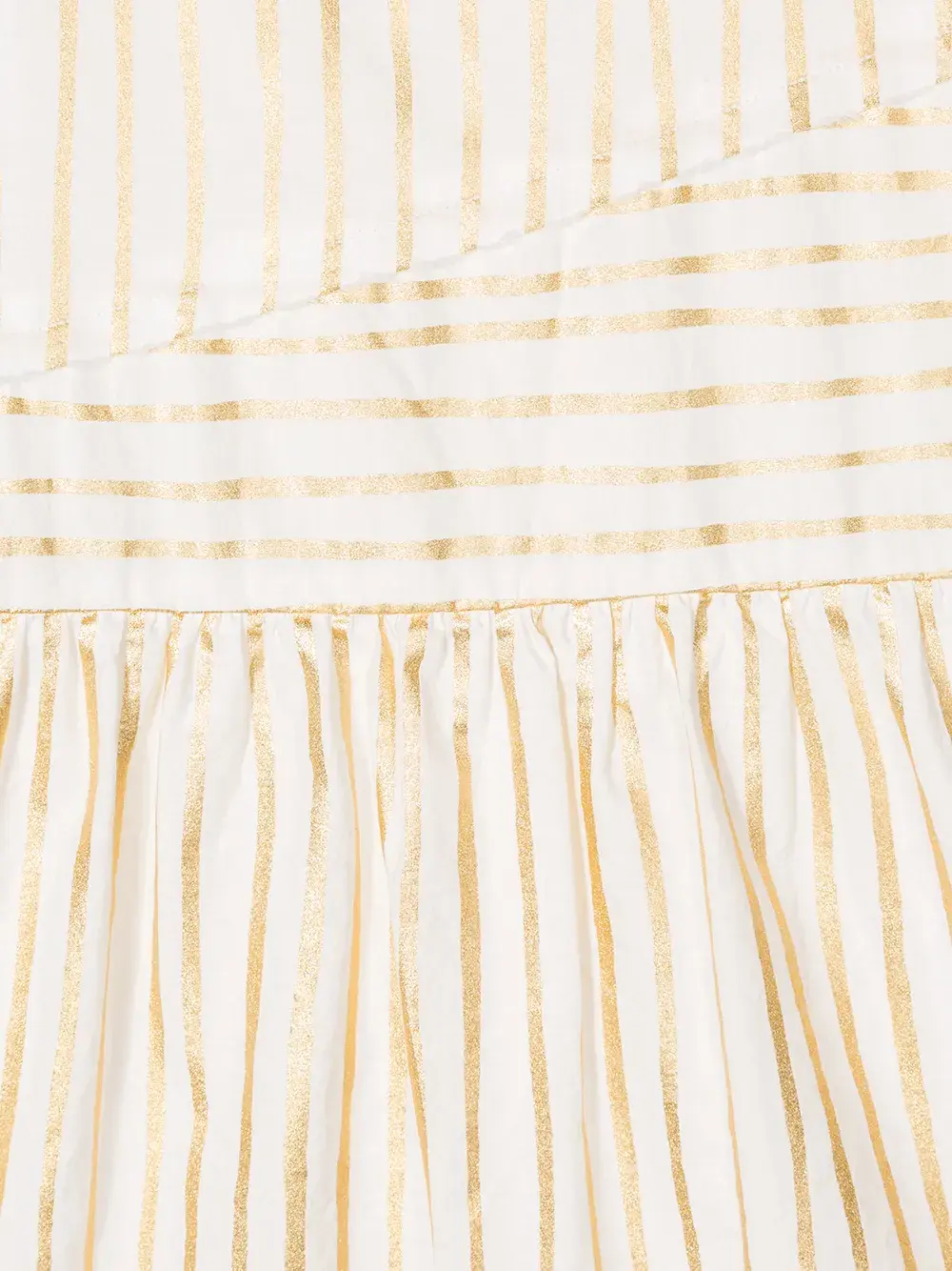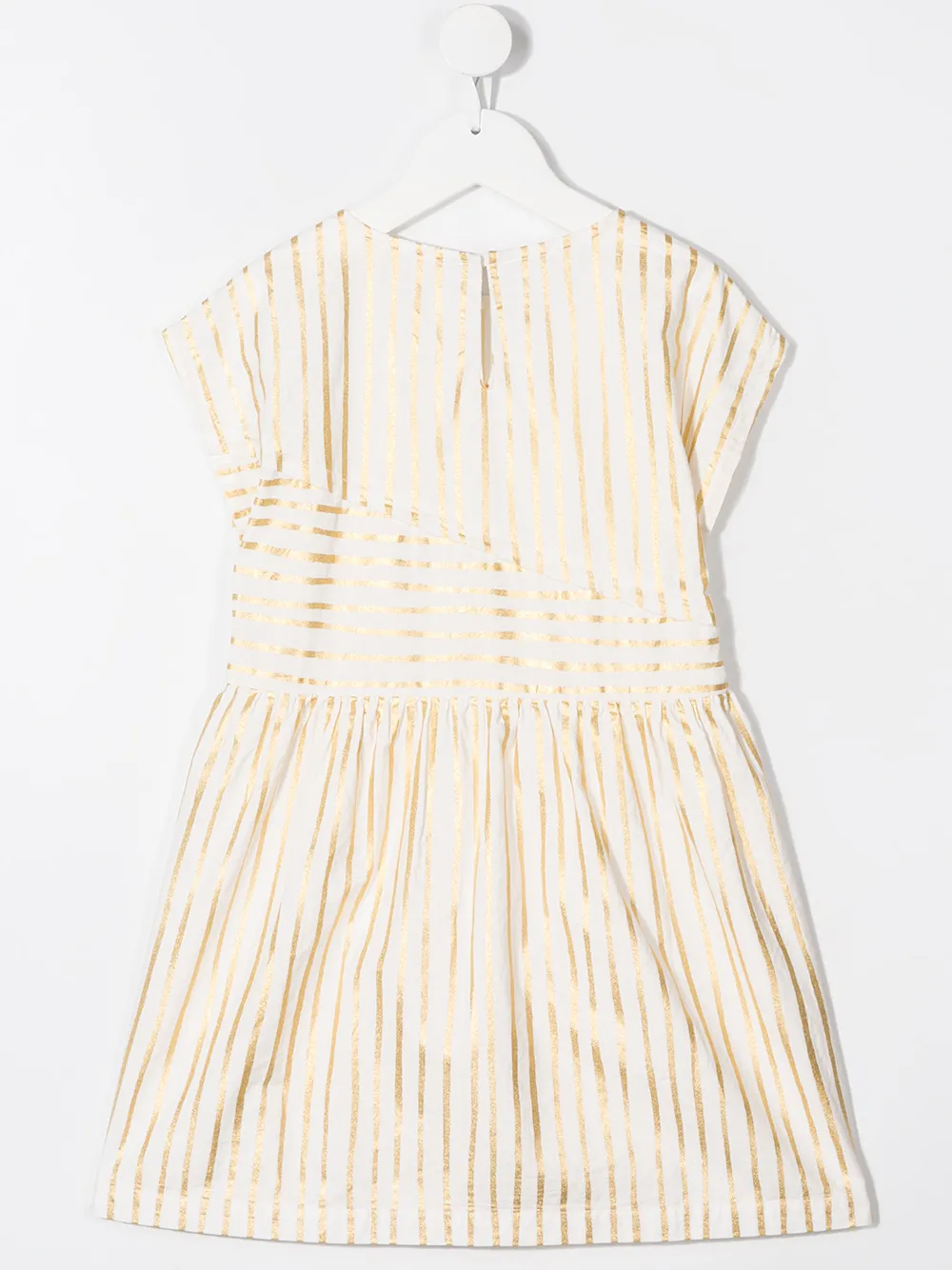 Платье миди в полоску от Andorine. Расклешенный силуэт, круглый вырез, задняя застежка на пуговице, короткие рукава, закругленный подол и средней длины.