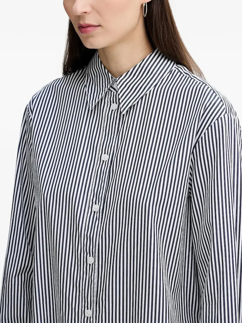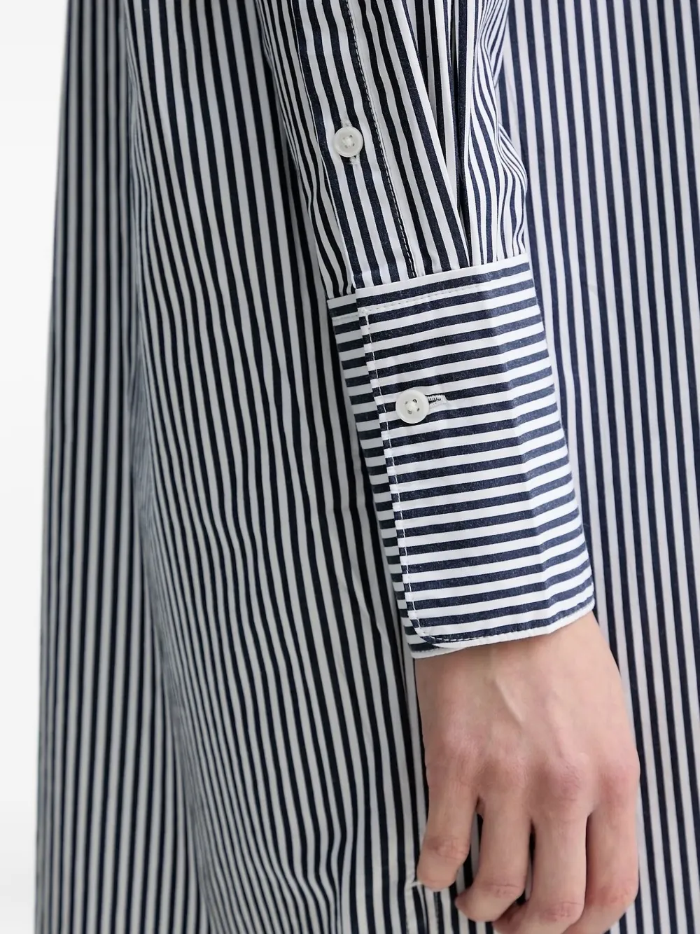 Темно-синий белый узор в тонкую полоску, застежка на пуговицы спереди, длинные рукава с манжетами, воротник-стойка