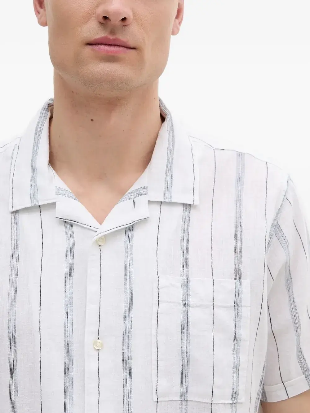 Белые вертикальные полосы, отложной воротник, короткие рукава, застежка на пуговицы спереди, короткие разрезы по бокам.