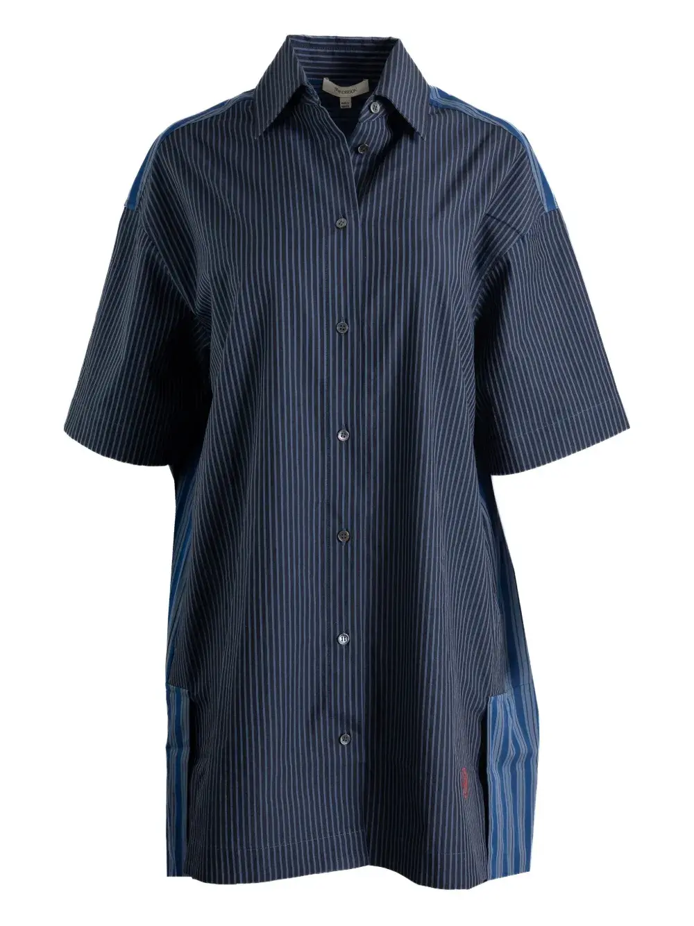Вертикальные полосы стального синего цвета, короткие рукава, застежка на пуговицы, панельный дизайн, прямой подол.