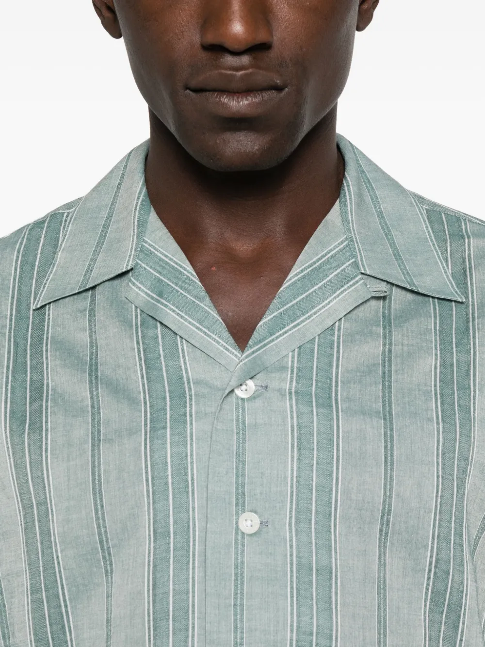 Зеленый полосатый узор, воротник-стойка, короткие рукава, застежка на пуговицы.