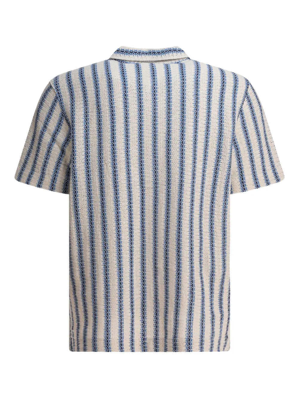 Синие полосы, застежка на пуговицы, короткие рукава, воротник-стойка.