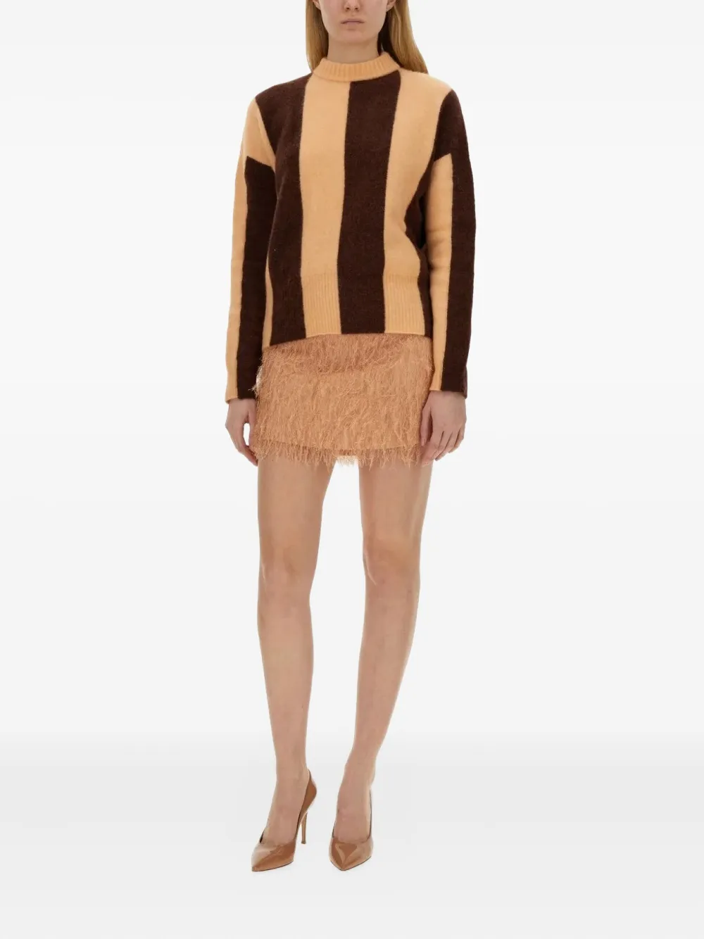 Коричневый полосатый рисунок с цветными блоками, высокий ворот, длинные рукава, ребристые манжеты и подол