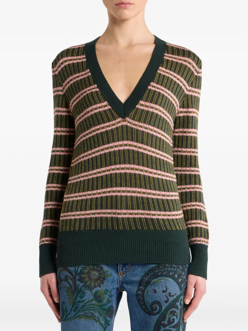 Полосатый свитер с V-образным вырезом ETRO, зеленый